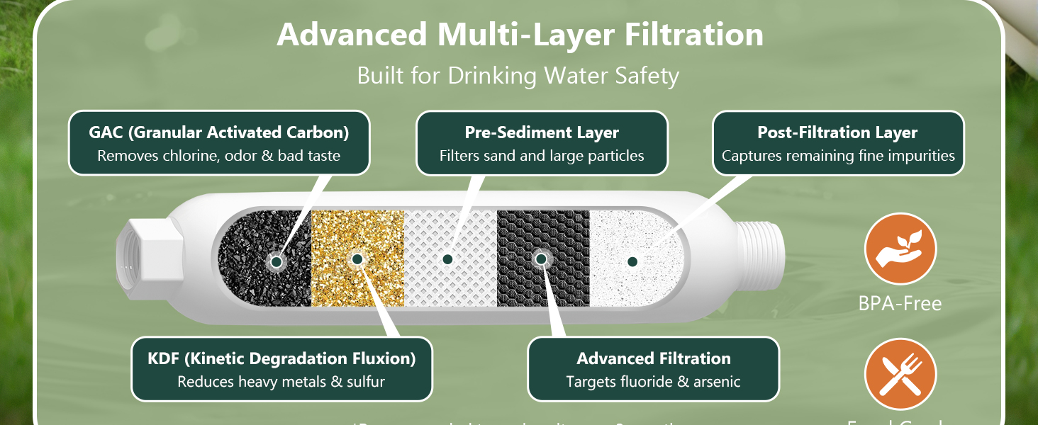 • أداء تدفق عالي دون فقدان الضغط - مصمم باستخدام GAC المتقدم (الكربون الحبيبي المنشط) ووسائط ترشيح KDF، يحافظ فلتر المياه المدمج هذا على تدفق مياه ثابت وعالي - مثالي للغسيل أو الاستحمام أو الطبخ أو ملء خزانات المياه دون التضحية بجودة الترشيح.