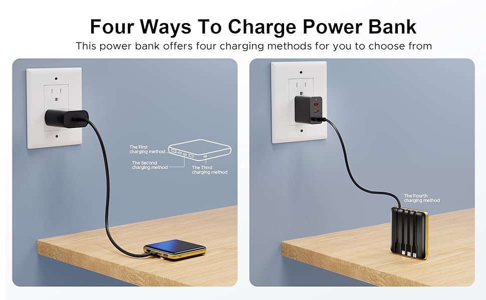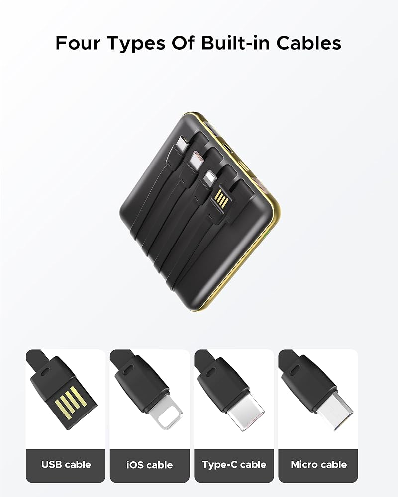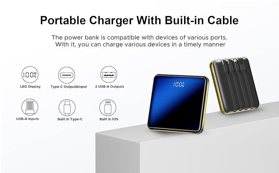 【6 طرق إخراج + 4 طرق إدخال 】 مجهزة بـ 4 كابلات مدمجة (USB-a، Micro-USB، كابل LT، Type-C) و3 منافذ إخراج (USB-a، Type-C، USB-a). أربع طرق إدخال (USB-A، Micro USB، واجهة LT، Type-C)