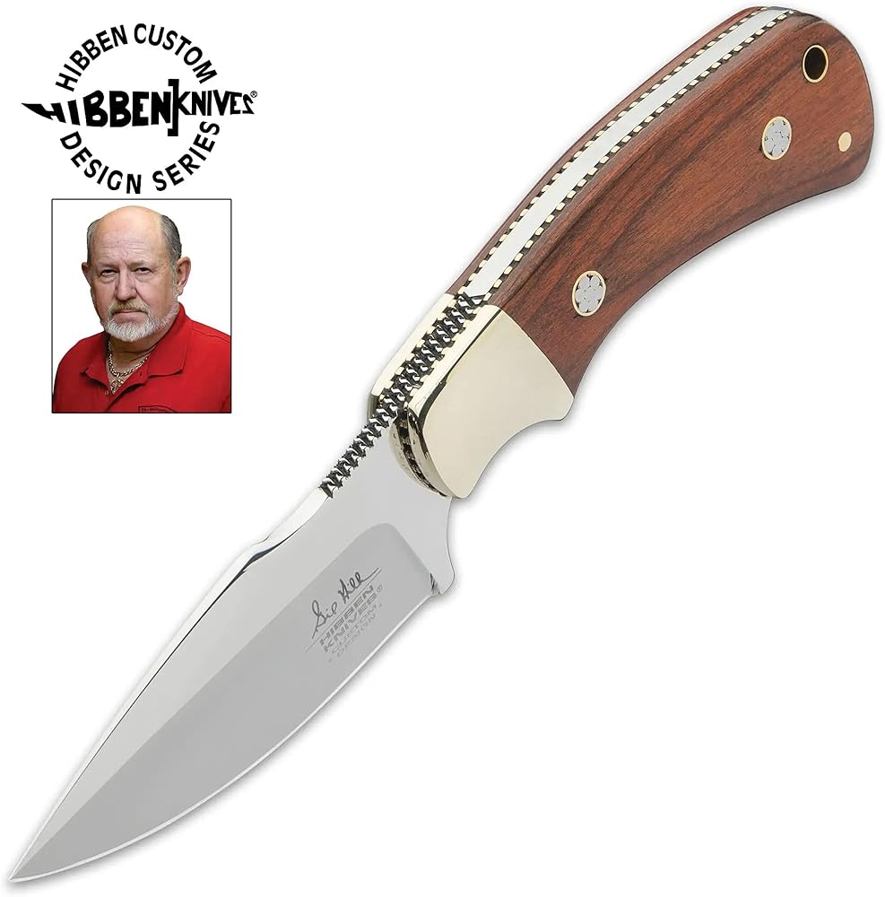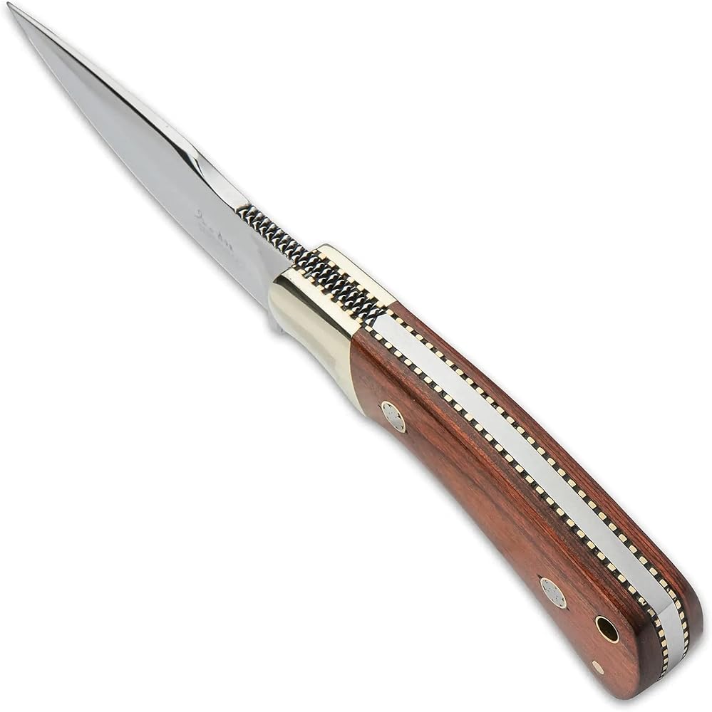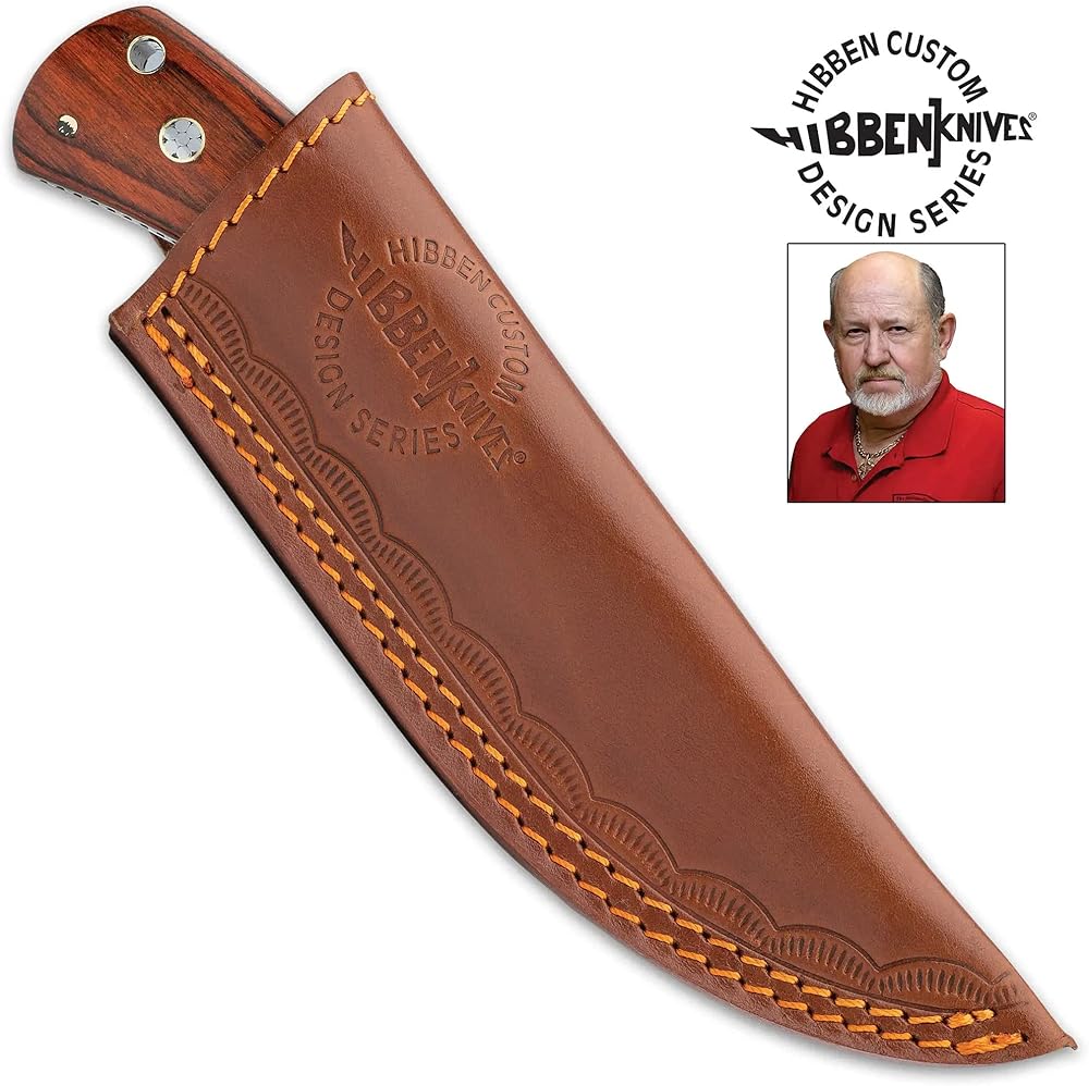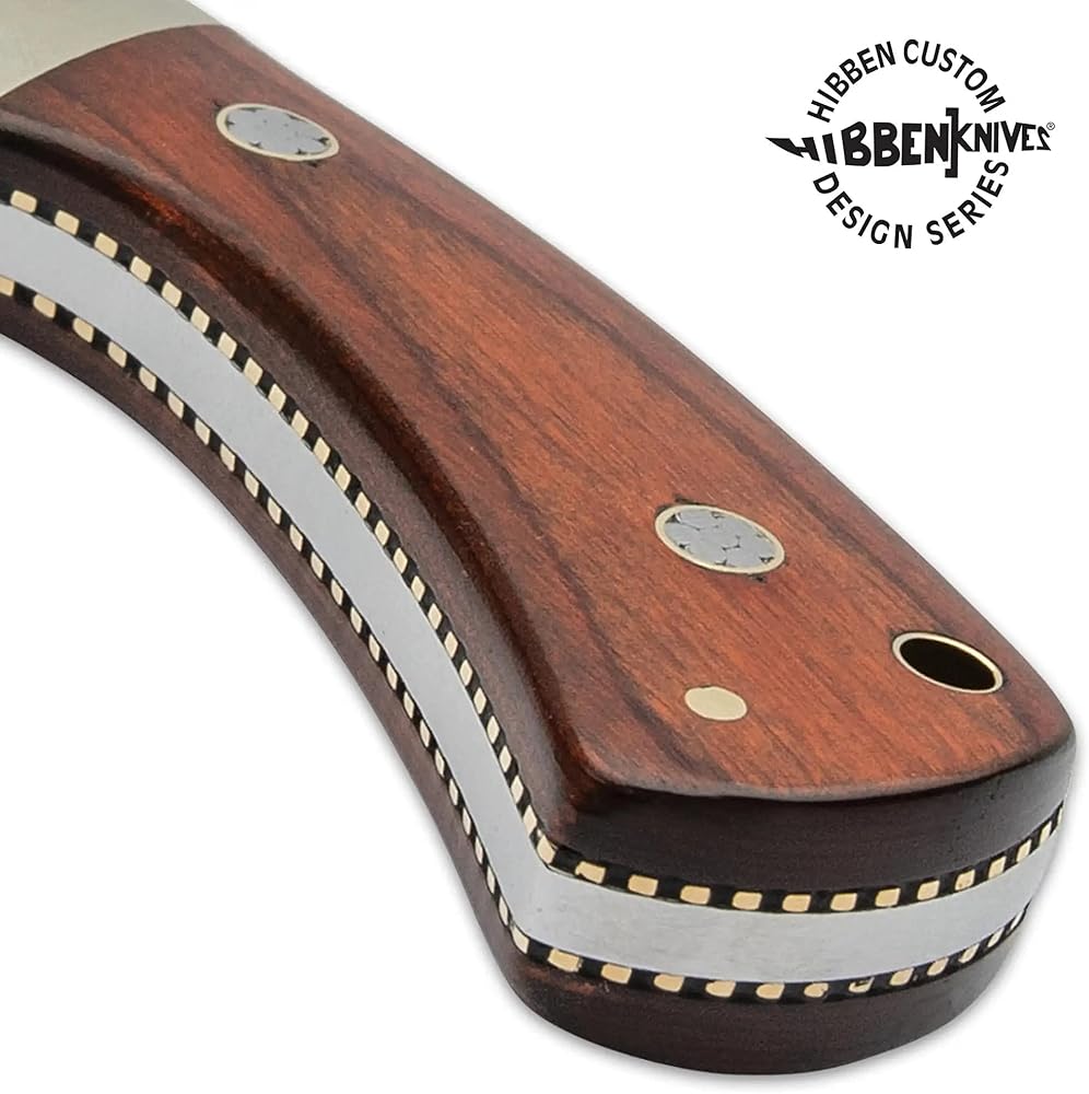 Knifemaker extraordinaire Gil Hibben continues to design exceptional knives made for hard everyday use. His Diamondback is a smaller fixed-blade designed to fit comfortably on your side. The knife has a 3 5/8”” full-tang, 7Cr17 steel blade with brass fileworked accents along the tang, extending from a nickel silver bolster with a high-polish finish. The handle scales are a rich, reddish brown pakkawood, accented with detailed mosaic pins and secured with nickel silver pins. The 7 7/8” overall fixed blade slides securely into a premium leather sheath and the handle has a brass lanyard tube.