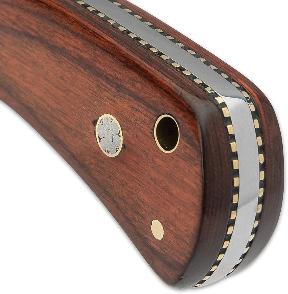 The handle scales are a rich, reddish brown pakkawood, accented with detailed mosaic pins and secured with nickel silver pins