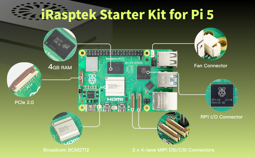 مرحبًا بك في أحدث جيل من Pi5: كمبيوتر كل شيء. يتميز Pi 5 بمعالج Arm Cortex-A76 رباعي النواة 64 بت الذي يعمل بسرعة 2.4 جيجا هرتز، ويوفر زيادة قدرها 2–3 مرات في أداء وحدة المعالجة المركزية مقارنةً بـ Pi 4. إلى جانب الارتقاء الكبير في أداء الرسومات من وحدة معالجة الرسومات VideoCore VII بسرعة 800 ميجا هرتز؛ إخراج عرض مزدوج 4Kp60 ؛ ودعم الكاميرا المتطور من معالج إشارة الصور المعاد تصميمه، فهو يوفر تجربة سطح مكتب سلسة للمستهلكين، ويفتح الباب أمام تطبيقات جديدة للعملاء الصناعيين.