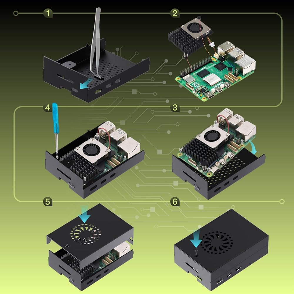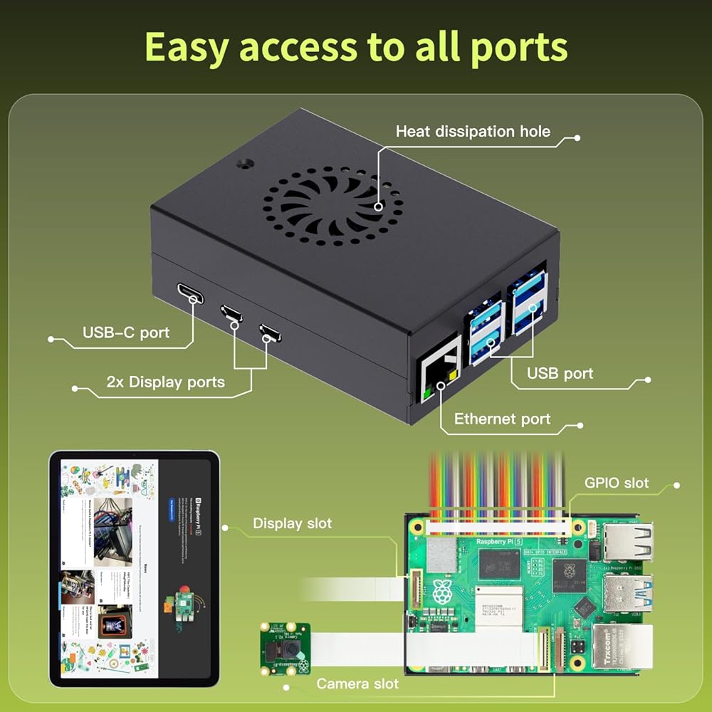 مبرد iRasptek النشط: المبرد النشط مصنوع من الألومنيوم المؤكسد عالي الجودة مع مروحة PWM عالية الأداء، وهي قادرة على تقليل درجة حرارة Pi 5 بشكل فعال والتأكد من الحفاظ على الأداء الجيد خلال فترات طويلة من التشغيل عالي التحميل.
