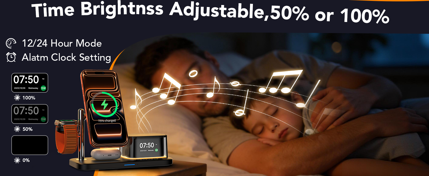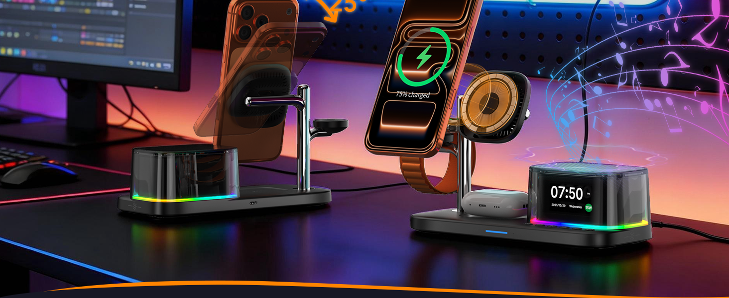 【محطة شحن لاسلكية 7 في 1/شاحن سريع 45 وات】تدعم محطة الشحن اللاسلكية 7 في 1 شاحن آيفون لاسلكي سريع Qi2.2 25 وات، ويتم تضمين شاحن عالي السرعة 45 وات، ومكبر صوت بلوتوث، وساعة منبه رقمية كبيرة، وإضاءة ليلية 8 ألوان، وشاحن iPhone اللاسلكي، وساعة Apple وشاحن Airpods. حرر نفسك من كابلات الشحن، ووفر المساحة وتنظيم مكتبك وغرفة النوم والمنضدة، فهو مفيد وجيد المظهر.
