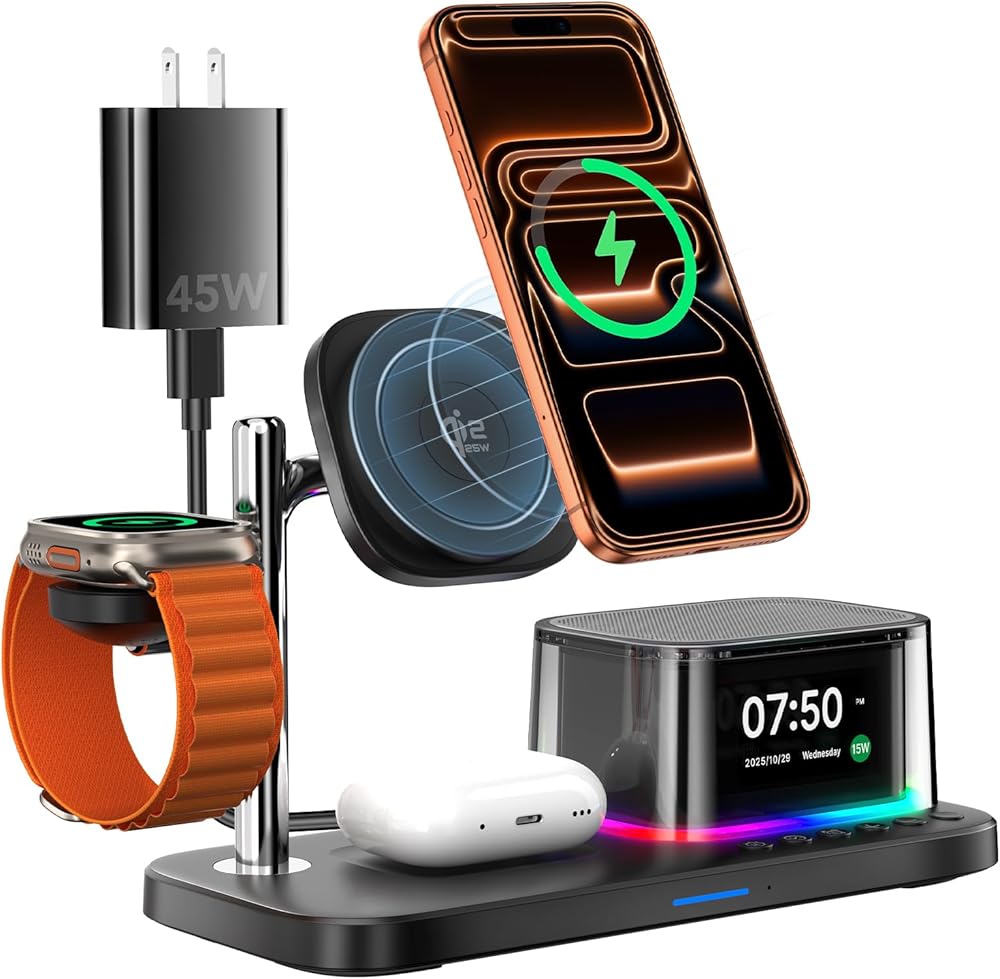 ساعة منبه مع شحن لاسلكي، محطة شحن 7 في 1 مع إضاءة ليلية، مكبرات صوت بلوتوث، شاحن مغناطيسي Qi2 25 وات لهاتف iPhone 17 16 15 14 13 12 Pro Max Plus Apple Watch Airpods، غرفة النوم