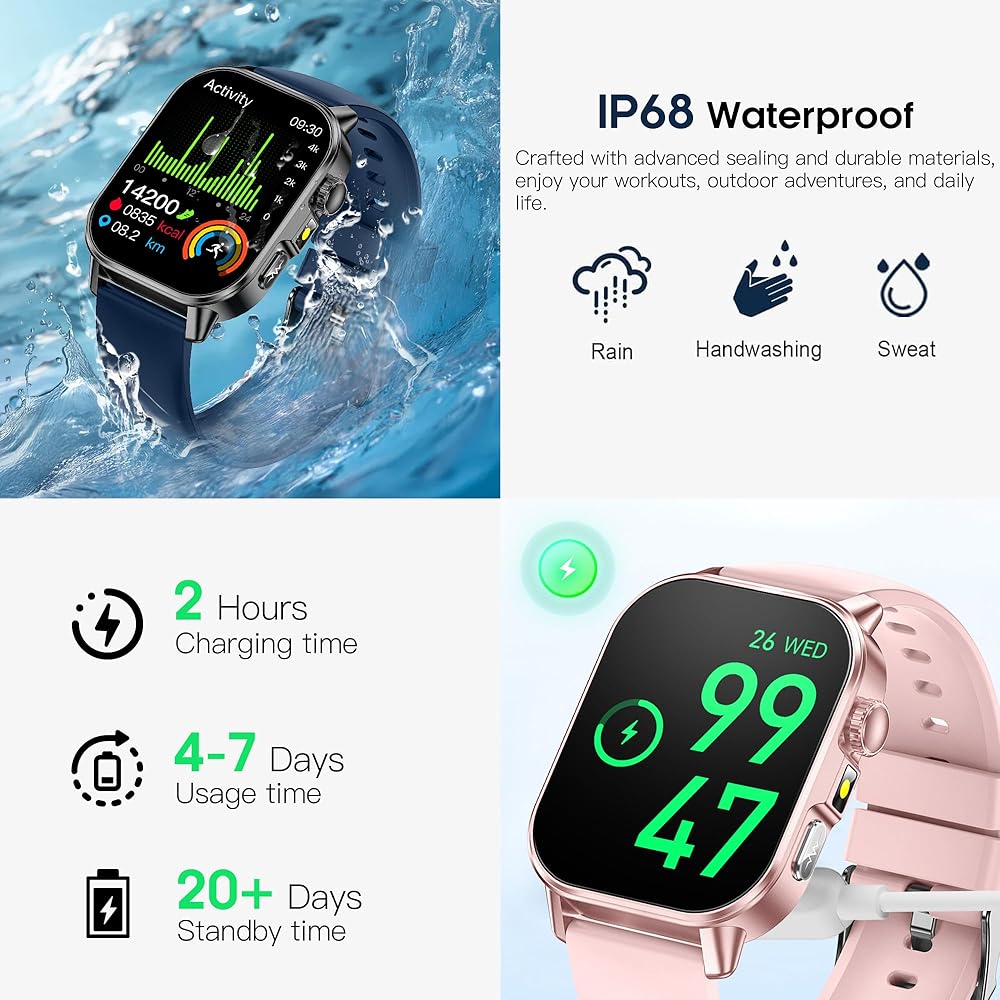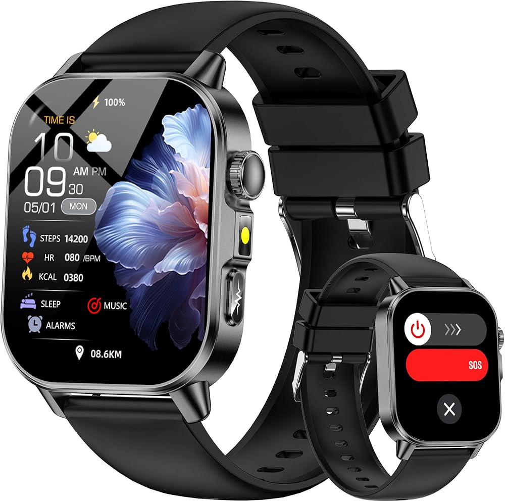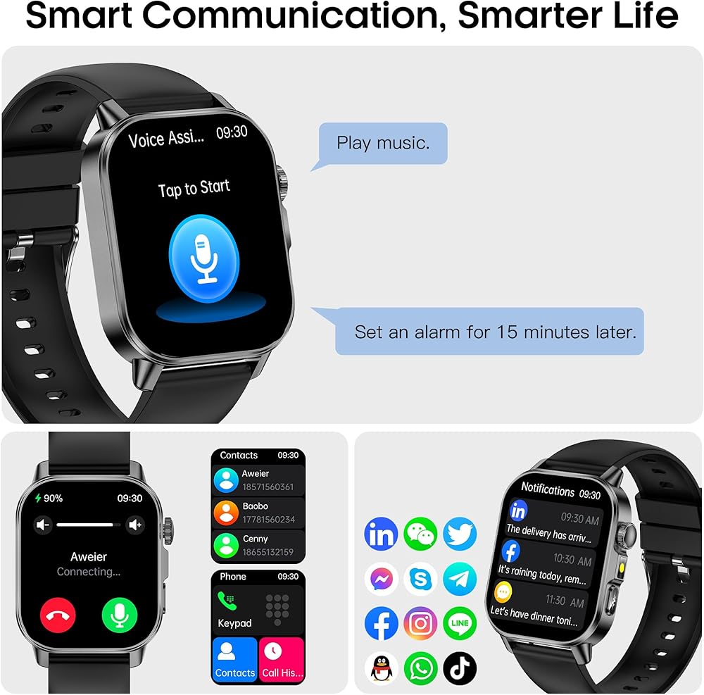 مكالمات بلوتوث وإشعارات ذكية ومساعد صوتي: تستخدم ساعة Bluetooth Call الذكية تقنية BLE 5.3 لاتصال أكثر استقرارًا وجودة مكالمات أكثر وضوحًا. يمكنك إجراء واستقبال المكالمات مباشرة على معصمك، وتلقي الإشعارات (فيسبوك، تويتر، وما إلى ذلك)، واستخدام المساعد الصوتي للتحقق من الطقس، أو ضبط المنبهات، أو أداء المهام اليومية. كما أنه يدعم وظيفة مكالمات الطوارئ SOS لضمان المساعدة السريعة في اللحظات الحرجة.