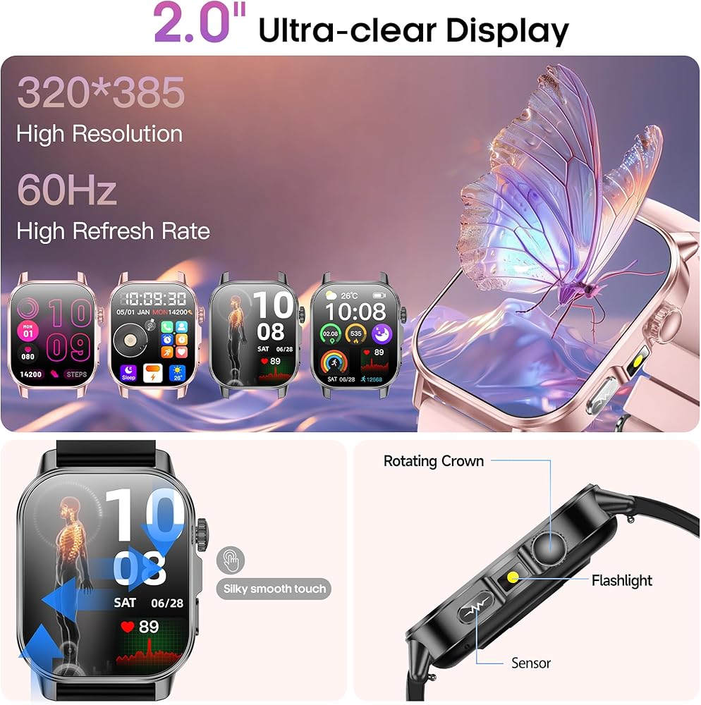 شاشة لمس كاملة عالية الدقة مقاس 2.0 بوصة ومصباح يدوي عالي السطوع: تتميز هذه الساعات الذكية للرجال والنساء بشاشة لمس كاملة عالية الدقة مقاس 2.0 بوصة بدقة 320 × 385، مما يتيح سهولة المشاهدة حتى في ضوء الشمس. تضمن المواد خفيفة الوزن ارتداءً مريحًا، وتتوافق المنحنيات الناعمة بشكل طبيعي مع المعصم. تحتوي ساعة Android على مصباح يدوي مدمج عالي السطوع بأربعة أوضاع - التشغيل دائمًا، والتشغيل الليلي، والمنبه، وSOS - مما يلبي احتياجات الإضاءة المختلفة بسهولة.