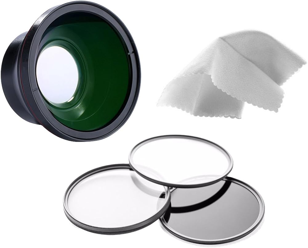 Lens: Power: 0.43x time conversion factor of your current lens setting plus a Macro mode., Optical System:Conversion type; mounts on front of existing lens., Mounting System:Screw type in front of existing camera lens into the filter accessory threads., Optics: High Definition, designed to maximize use day and night with coated optics to provide maximum image transmission with minimum distortion., Auto Focus:Utilizes camera auto focus system., Adaptability:Maintains all the camera functions plus it provides 0.43X wide angle lens conversion power., Macro:The Macro mode is accomplished by unscrewing the front lens assembly and using the section labeled Macro with your existing camera lens., Accepts 82mm Filters., Includes lens cap, bottom cover, & pouch. Filters: UV filter (Ultraviolet 1A) for protection against dust, dirt, scratches, fingerprints and the sun's ultraviolet rays. Circular Polarizing Filter: Rotatable, used to increase color saturation, like darkening blue skies so that white clouds stand out. FL-D filter (Fluorescent) for taking pictures indoors under fluorescent lights. This filter removes the greenish tint given off by fluorescent lighting. These filters are multi-threaded & multi-coated, and can be stacked one on top of the other, compact protective carrying case for transporting and storing your set of filters.Nwv Direct Micro Fiber Cleaning Cloth: Soft-tex silicone cloth for wiping camera lens and other exterior surfaces.