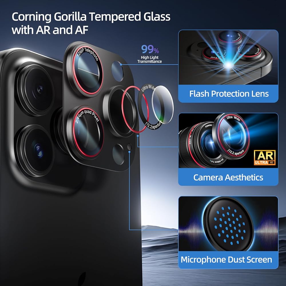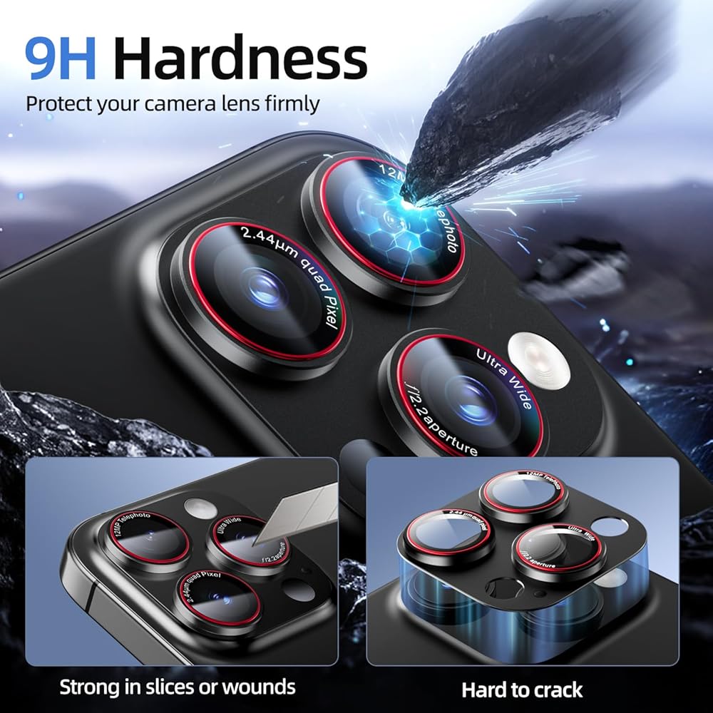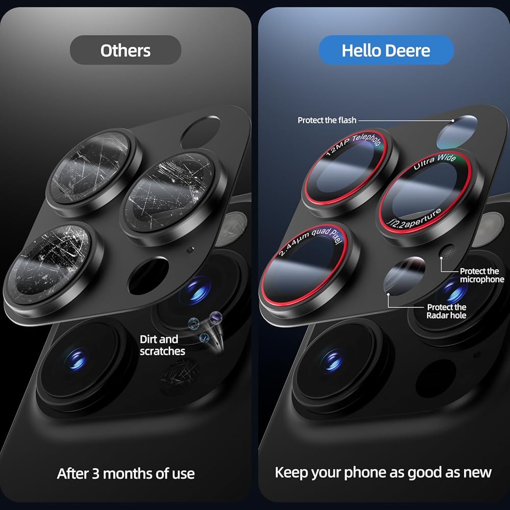 【لهاتف iPhone 16 Pro Max/iPhone 16 Pro/iPhone 15 Pro Max/iPhone 15 Pro /iPhone 14 Pro Max/iPhone 14 Pro】: صممت HelloDeere هذا الغشاء الواقي لعدسة الكاميرا المتطورة وفقًا لهيكل ووظيفة كاميرا iPhone 16 Pro Max. تتميز النسخة المطورة من معدن الطيران 2025 بتحسين مقاومة السقوط ونفاذية الضوء ومقاومة الخدش. يمكن أن يناسب معظم حافظات الهواتف المحمولة بشكل مثالي ويوفر حماية على مستوى الطيران لعدساتك.