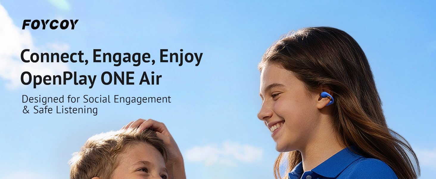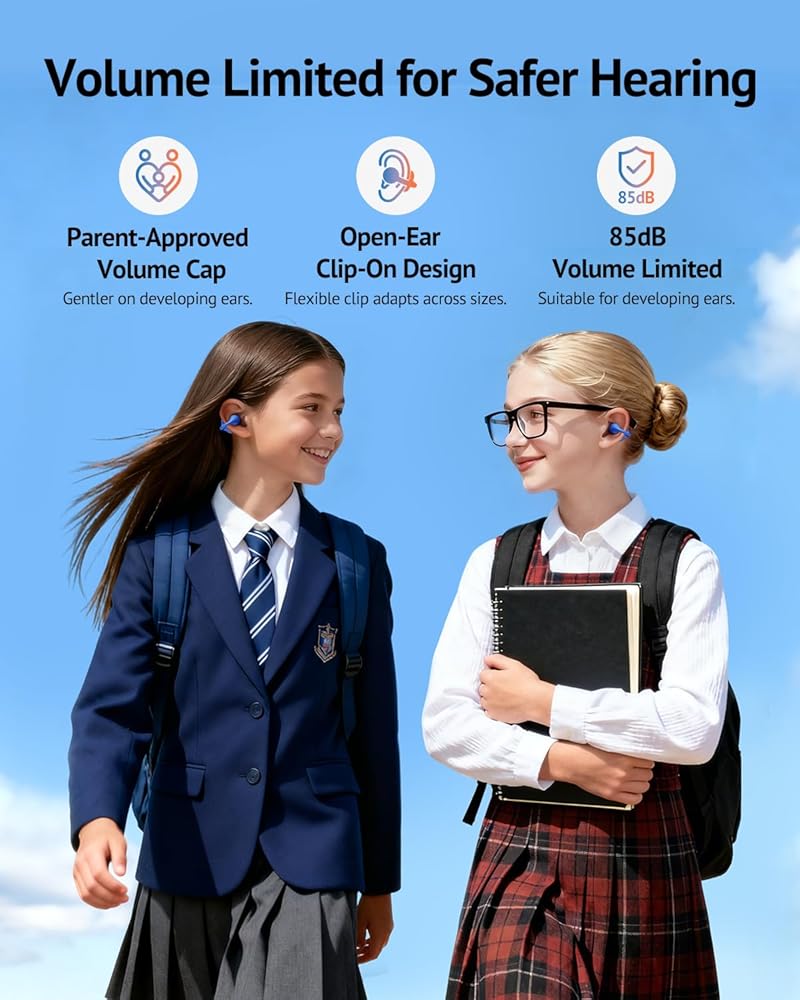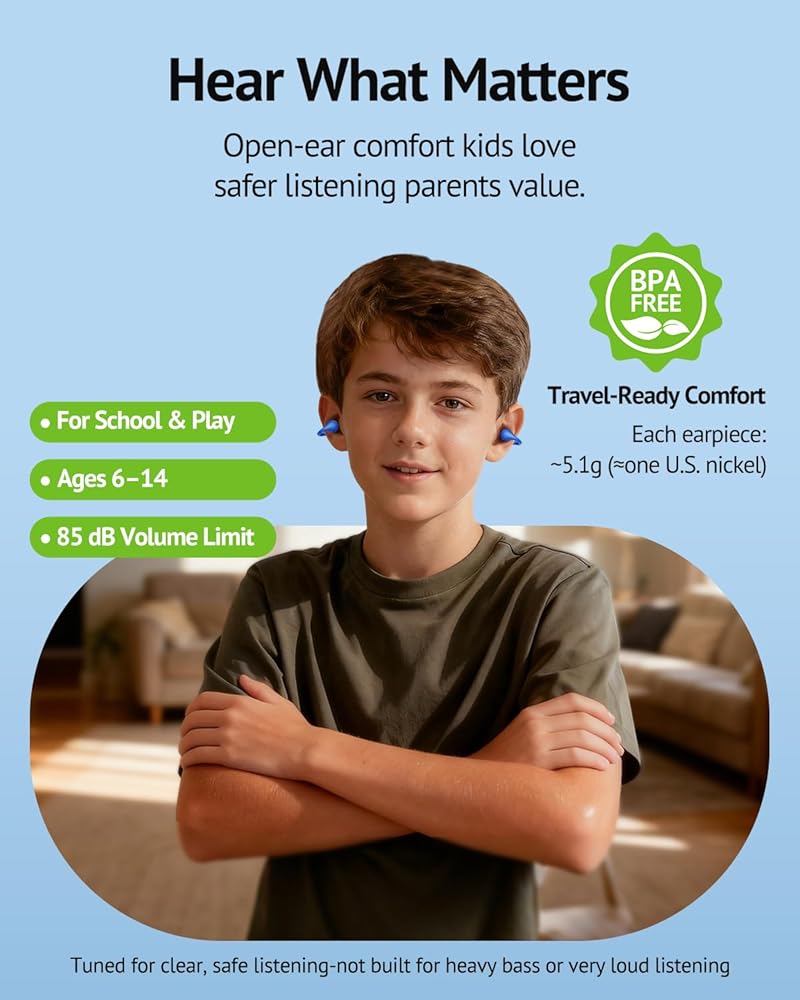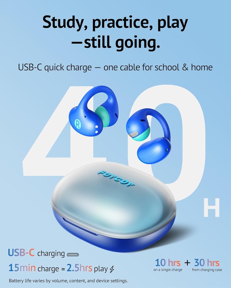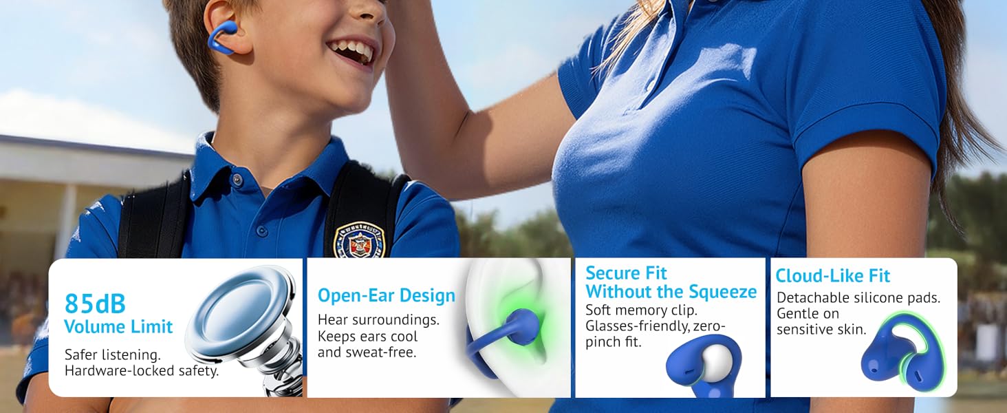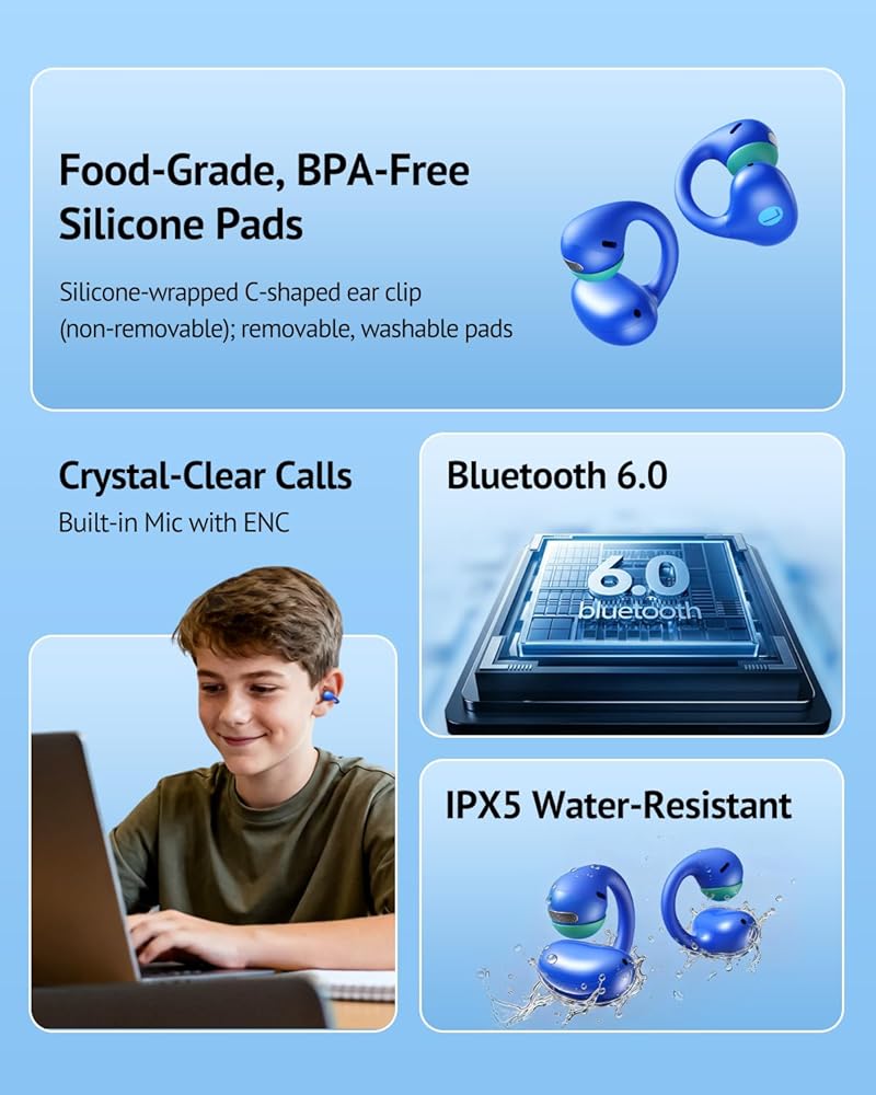 سماعات أذن مفتوحة للأطفال من FOYCOY - سماعات أذن بمشبك - حد حجم 85 ديسيبل - بلوتوث 6.0، ميكروفون مدمج، وقت تشغيل 40 ساعة، وسادات سيليكون، IPX5، مناسبة للأذنين الصغيرة والنظارات، للأعمار من 6 إلى 14 عامًا، أزرق