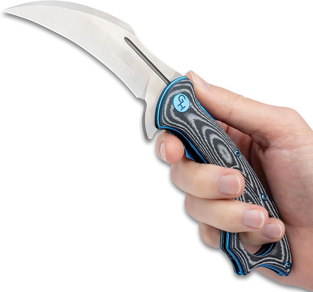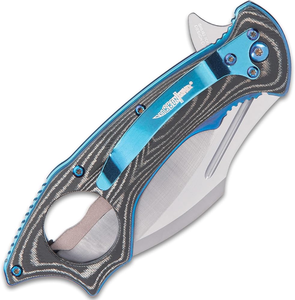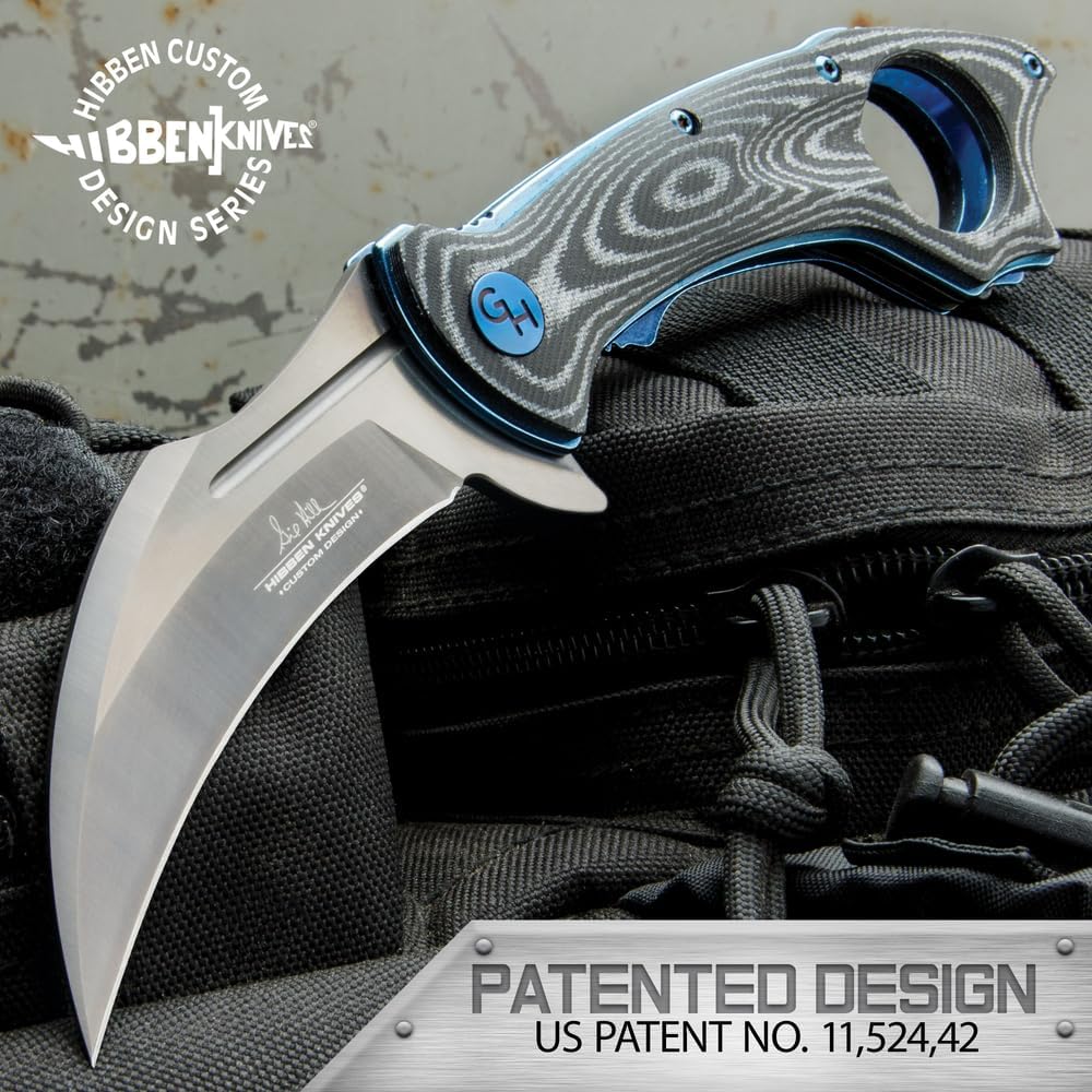 The Gil Hibben original Warbird Folding Karambit is a mix of modern looks with practical purpose. Easily access the 3 1/8” 7Cr17 stainless steel curved blade by using the flipper. The patent pending blade covering mechanism ensures safety for the user when closing the knife while also allowing the blade to be the full length of the handle. Metallic blue liners accent the dark grey linen Micarta and are visible within the open ring pommel
