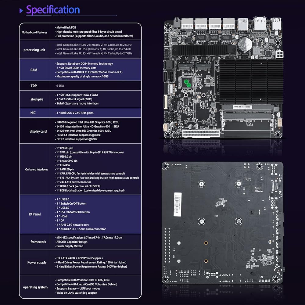 Powerful Processor: StoneStorm 6-Bay NAS board is compatible with Intel Celeron J4125 quar core 4threads, 4MB Cache, up to 2.7GHz, it's 6.7" x 6.7" mini-ITX form factor, basic TDP is 9-15W, and it supports Windows 10/11, Linux