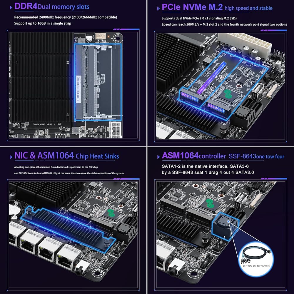 Large Capacity: 2* DDR4 slots, compatible with 2400/2133/2666MHz (non-ECC), RAM supports up to 32GB, 2* SATA3.0, SATA1-SATA2 ports are native 6Gbps, 1* SFF-8643(It can be expanded to 4* SATA3.0 6Gbps by the 8643 cable we send), 2* M.2 NVMex1 slots 2280, stable and ultra-fast transfer speed