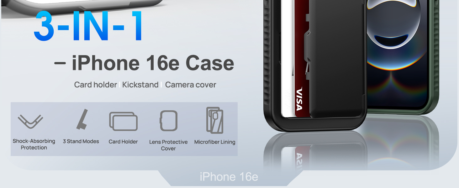 حافظة محفظة لهاتف iPhone 16e، حامل بطاقات مدمج (4-5 بطاقات)، حامل غطاء الكاميرا، حماية من السقوط من الدرجة العسكرية، حافظة هاتف واقية متينة من السيليكون للرجال والنساء لهاتف iPhone 16e، أسود