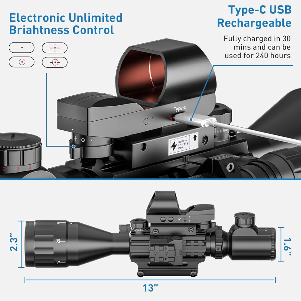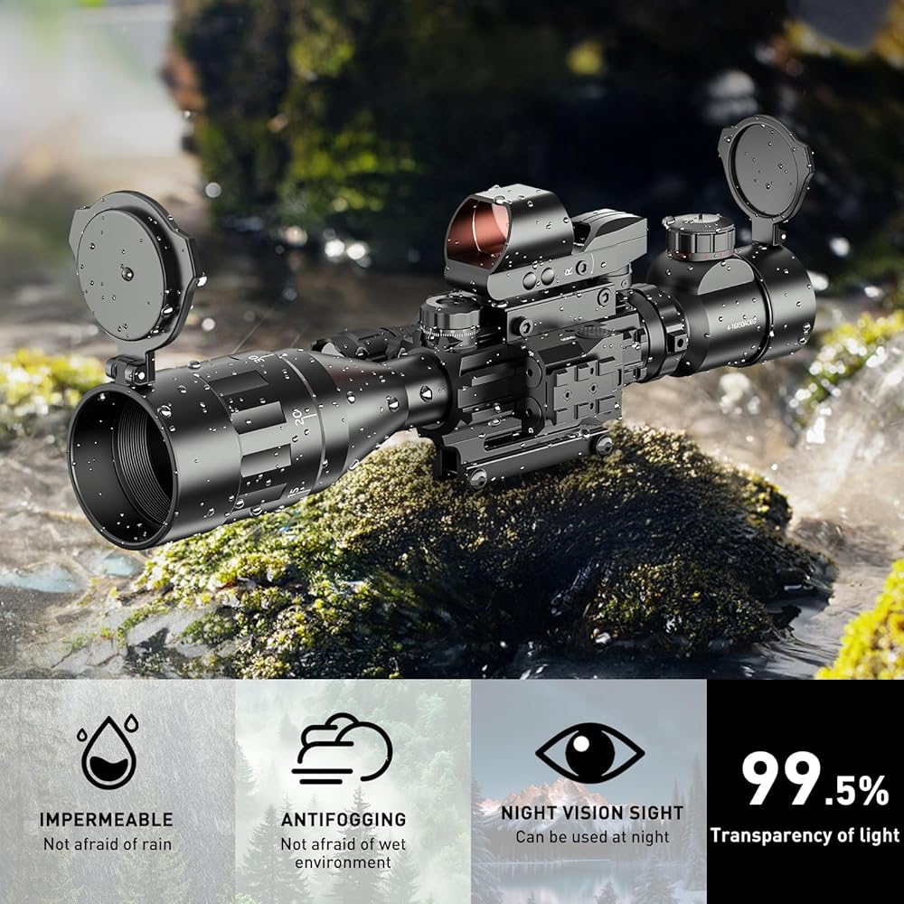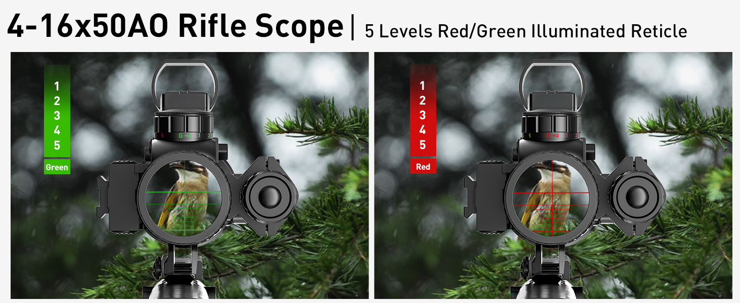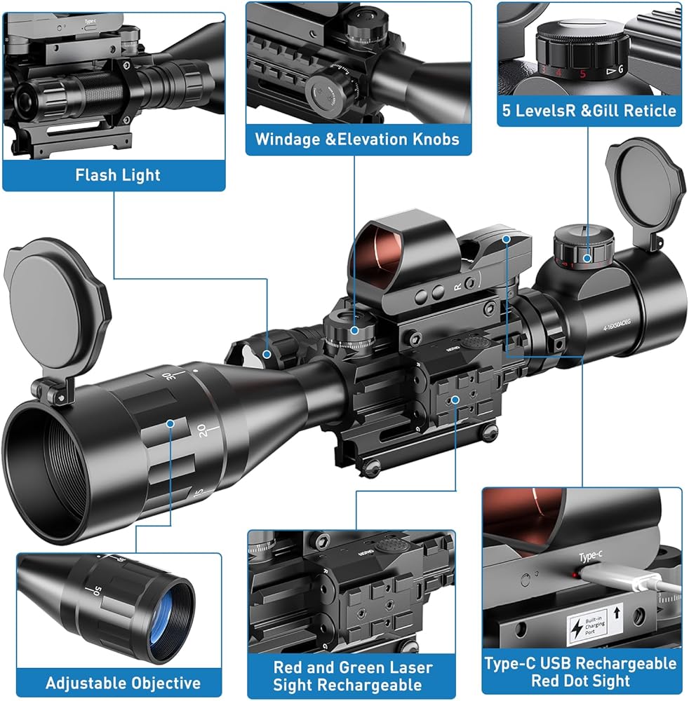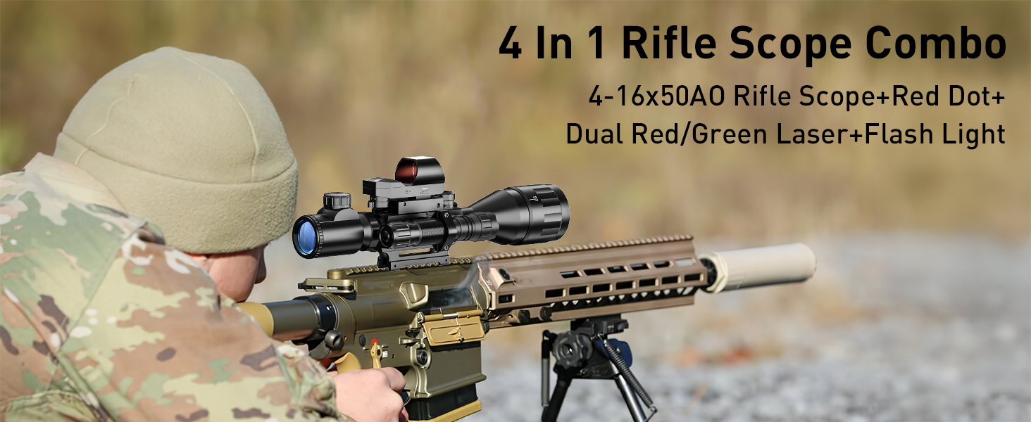 • مجموعة 4 في 1: نطاق بندقية 4-16x50AO، 4 أنماط شبكاني ثلاثي الأبعاد، منظر نقطة حمراء، 5 أوضاع سطوع، مصباح يدوي ليزر أحمر/أخضر.
