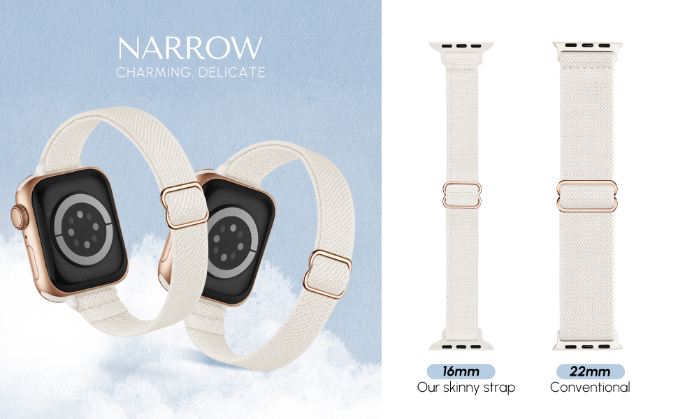 نحيل. رفيعة: أحزمة ساعة Apple القابلة للتمدد للنساء بعرض أضيق 16 مم تبعث نمطًا رائعًا ورقيقًا، والمظهر النحيف يجعلك أكثر سحرًا وإشراقًا! قم بإضفاء الطابع الشخصي على iWatch الخاص بك ليناسب ملابسك في الحياة اليومية وسهولة التغيير في كل مناسبة، دون الحاجة إلى أدوات.