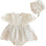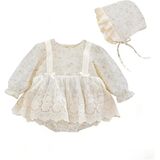 Dress your little princess in timeless elegance with this exquisite floral romper outfit. This beautifully crafted one-piece features delicate lace detailing and a charming floral print in soft, neutral tones. The long sleeve design provides comfort and warmth, while the intricate lace overlay on the skirt creates a stunning dress-like appearance. The outfit comes complete with a matching bonnet, perfect for special occasions or memorable photo opportunities. The bodysuit design makes changing easy, while maintaining the look of a sophisticated dress. The fabric combination offers a perfect balance of style and comfort, ideal for newborns and infants during their first year. The vintage-inspired pattern paired with classic lace trim creates an heirloom quality piece that's both practical and beautiful. The gathered waist and full skirt add graceful movement, while the snap closures ensure easy dressing. This versatile outfit is suitable for celebrations, portraits, or any occasion where you want your little one to look absolutely adorable.