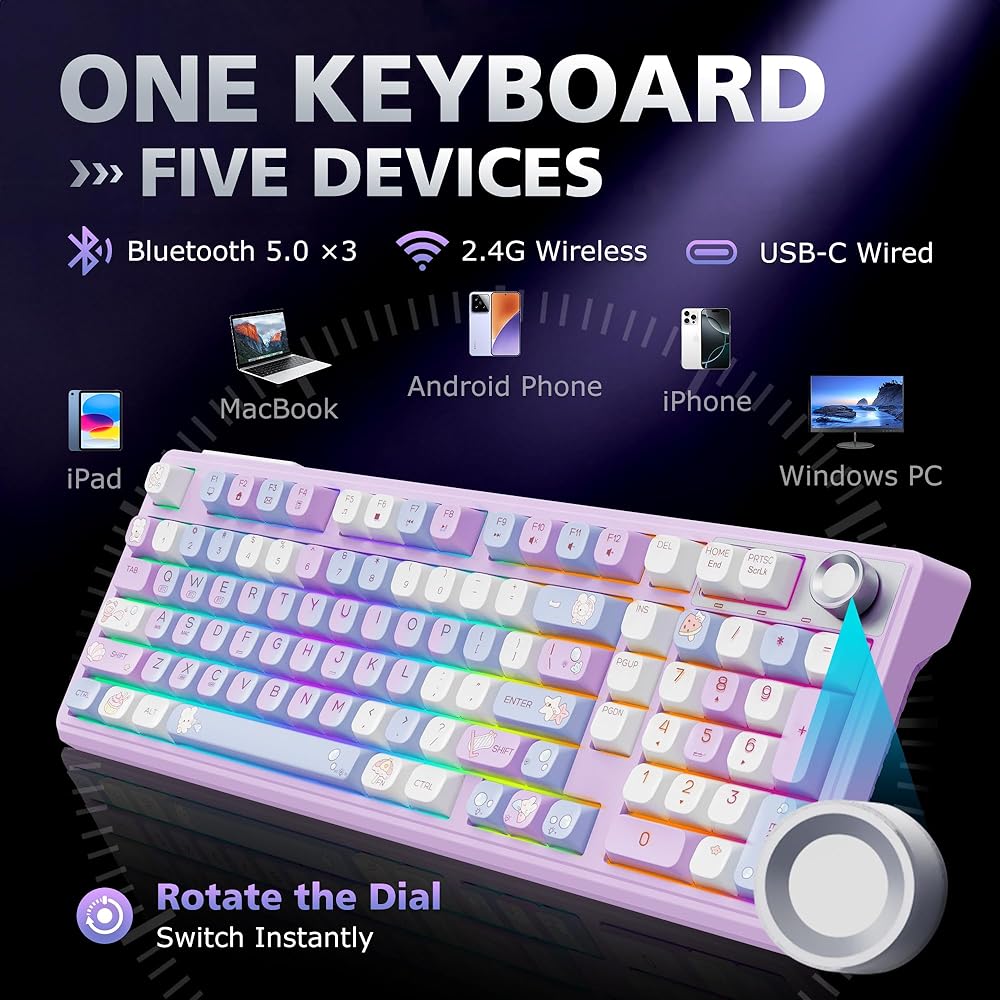 • 【اتصال ثلاثي الأوضاع 】يدعم لوحة مفاتيح بلوتوث، ولوحة مفاتيح الألعاب اللاسلكية 2.4 جيجا هرتز، وأوضاع لوحة المفاتيح الميكانيكية السلكية USB. يمكنك التبديل بسهولة بين الأجهزة، مما يجعلها لوحة مفاتيح بلوتوث لاسلكية متعددة الاستخدامات لمستخدمي أجهزة الكمبيوتر الشخصية وWindows وMac والكمبيوتر المحمول