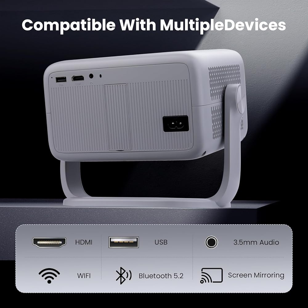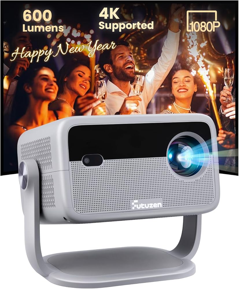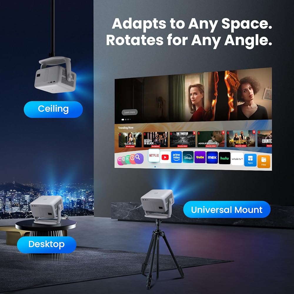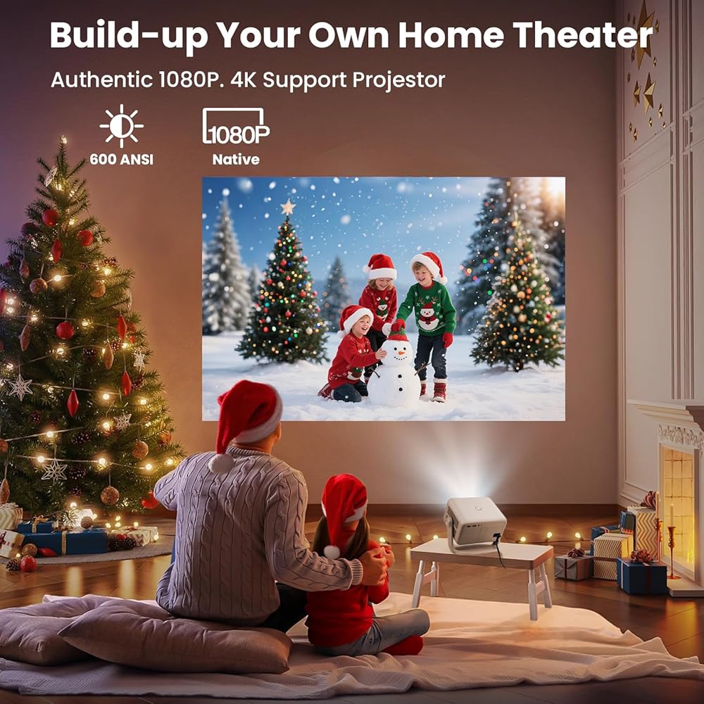 جهاز عرض ذكي مع واي فاي وبلوتوث، تطبيقات مدمجة، جهاز عرض محمول بقوة 600 لومن ANSI مع حامل، جهاز عرض صغير 1080 بكسل لغرفة النوم، حجر مفاتيح تلقائي وتركيز E أجهزة عرض سينما منزلية داخلية وخارجية 4K