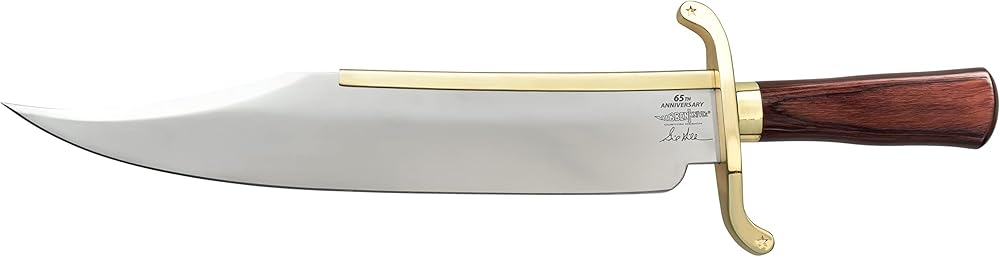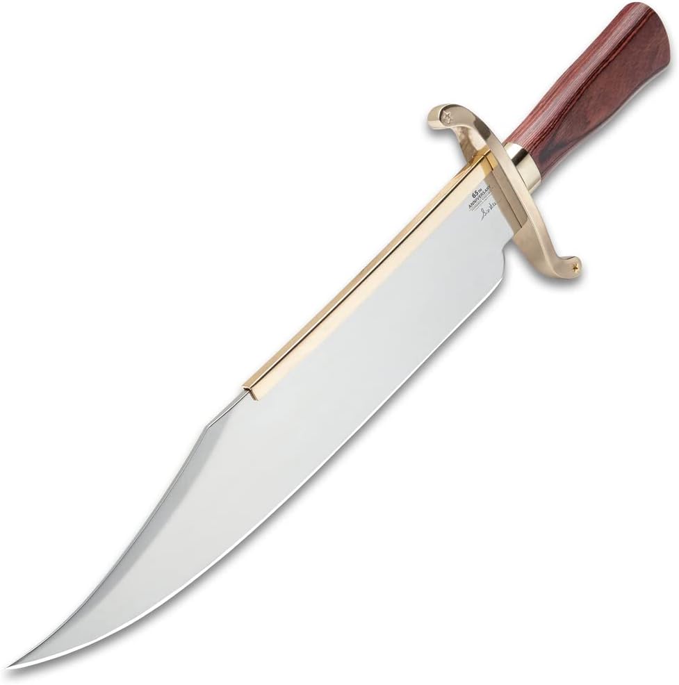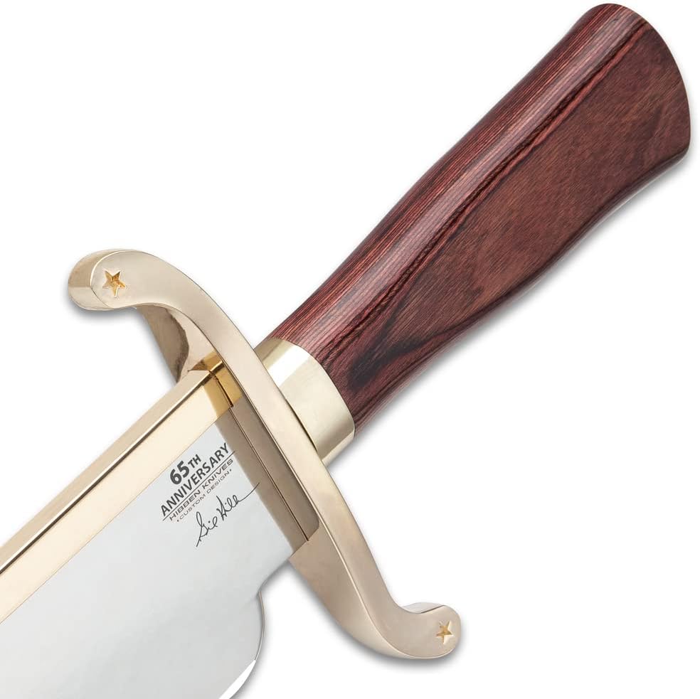Coming straight from industry icon Gil Hibben, you'll be the envy of knife collectors everywhere with this Hibben Knives 65th Anniversary Old West Bowie Knife. The knife is not only impressive with its 14” stainless steel clip point blade and reddish-brown wooden handle, it's a commemoration of Hibben's 65-year legacy. This is noted by the unique antiqued brass tribute coin set into the basket-weave leather of the belt sheath. The knife itself has its own unique accents with a gold-plated blade catcher and handguard. While it's certainly a looker, it is also built tough and ready for action. Tackle any obstacle when you have this intimidating 20 1/2" bowie knife at your side.