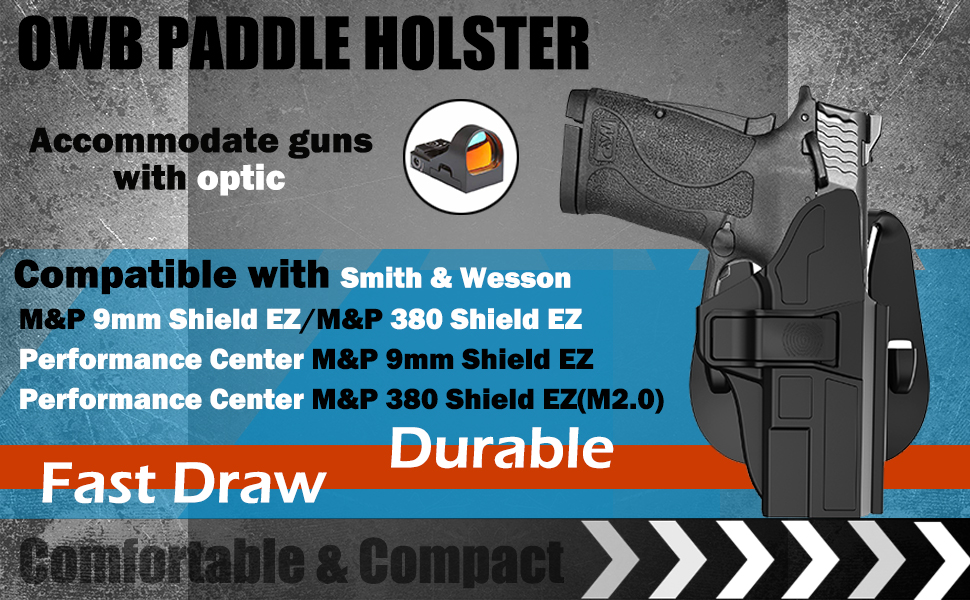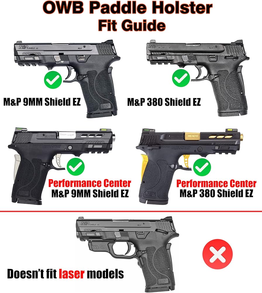 Fit Guide: This OWB paddle holster fits Smith & Wesson M&P 9mm Shield EZ; Smith & Wesson M&P 380 Shield EZ; S&W Performance Center M&P 9mm Shield EZ; S&W Performance Center M&P 380 Shield EZ(M2.0) - Right Handed(NOTE: Doesn't fit M&P M2.0 METAL Carry Comp, M&P Shield Plus Carry Comp or guns with high front sight, light or laser)