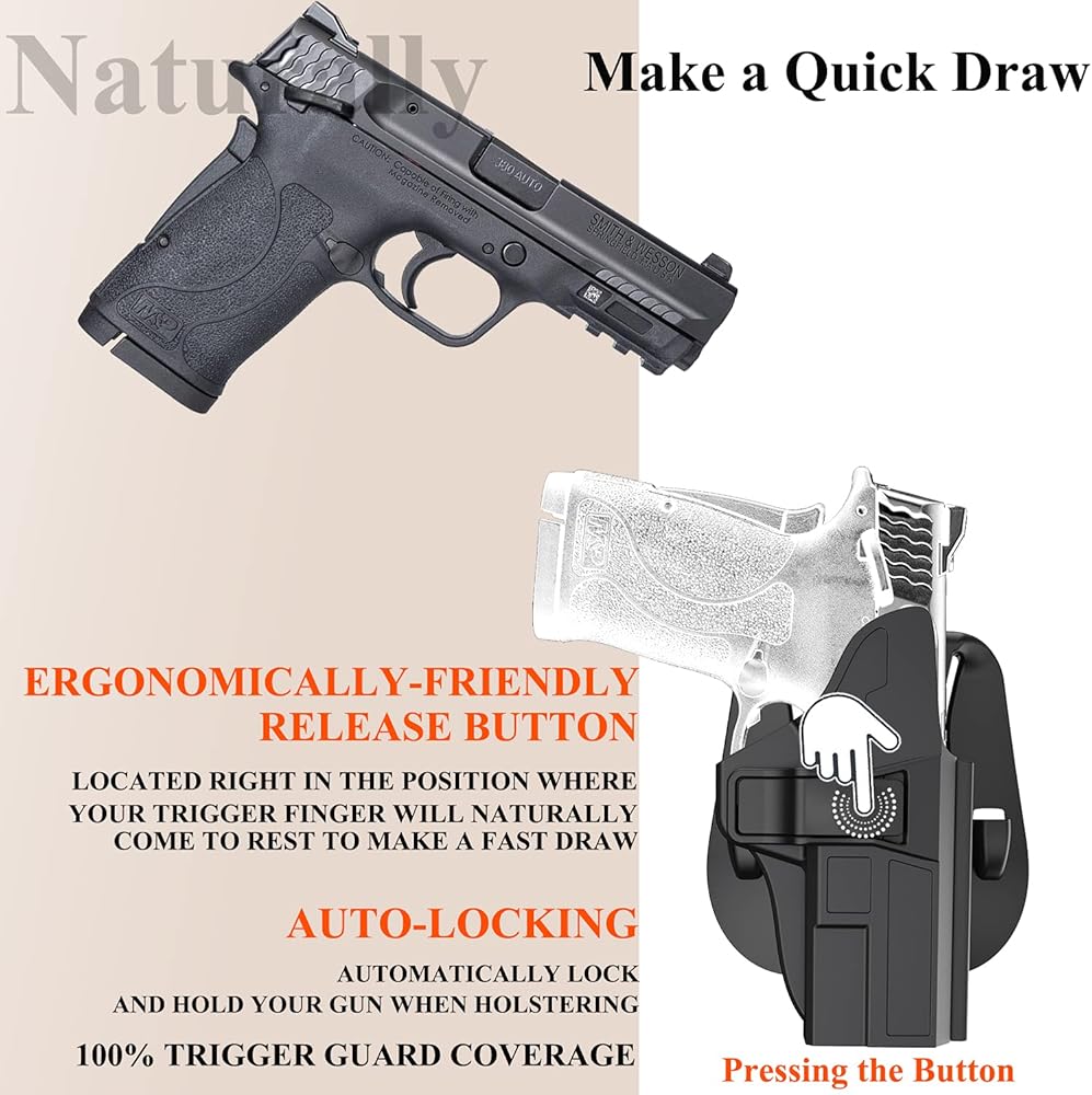 Make a Quick Draw: This holster for M&P 9mm Shield EZ holds the gun close to your body and the ergonomically friendly release button is right in the position where your trigger finger will naturally come to rest in order to make a fast draw with one hand. The auto-locking mechanism feature will automatically lock and hold your firearm safely and 100% trigger guard coverage while holstered.