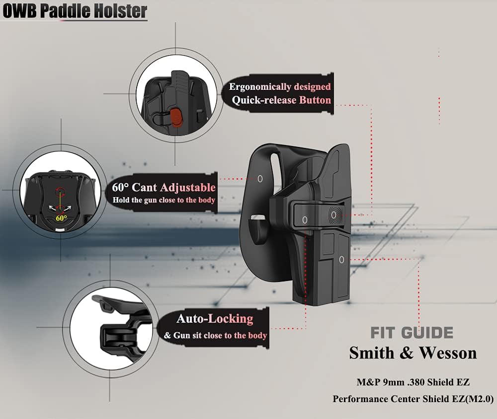 Adjustable Carrying Angle: This M&P Shield EZ 9mm holster comes with 60° adjustable belt paddle that allow you to quickly attach or remove your OWB holster from your pants or belt in width up to 2". No need to remove or unbuckle the belt when attaching or removing the holster. Simply adjust the paddle with the Allen Key (included) to get your desired carry angle.(Tip: You can use it with the belt or without it)