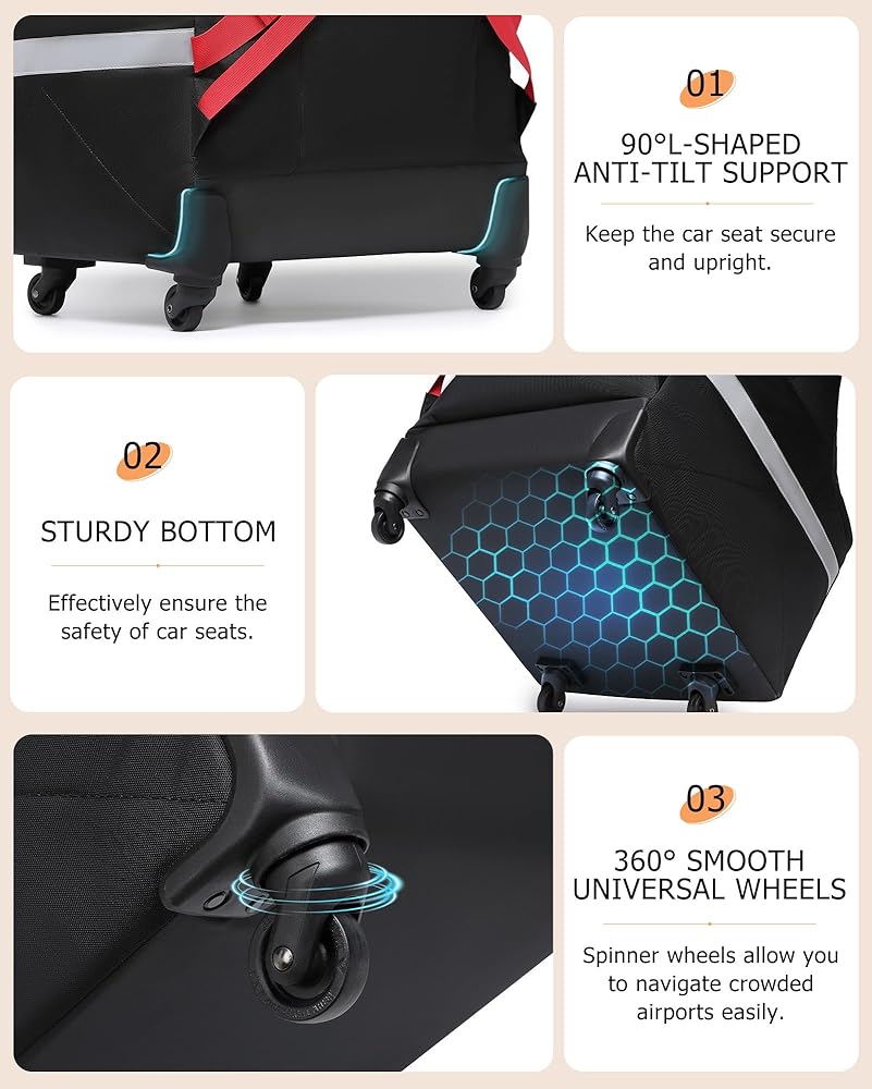 أداء ممتاز: تتميز حقيبة السفر لمقعد السيارة MCBD للطائرة بـ 4 عجلات دوارة قوية، مما يسمح لها بالتحرك بشكل مستقيم في أي اتجاه. إنها مثالية للتنقل في المطارات المزدحمة. يوفر الجزء السفلي الصلب المقترن بعجلات خلفية على شكل حرف L الثبات، مما يبقيه في وضع مستقيم أثناء الاستخدام ويمنع الانقلاب. يجعل نقل مقعد السيارة الخاص بطفلك سهلاً ومريحًا.