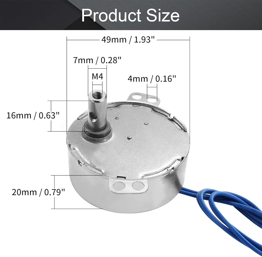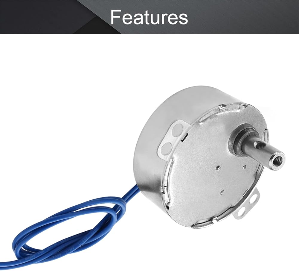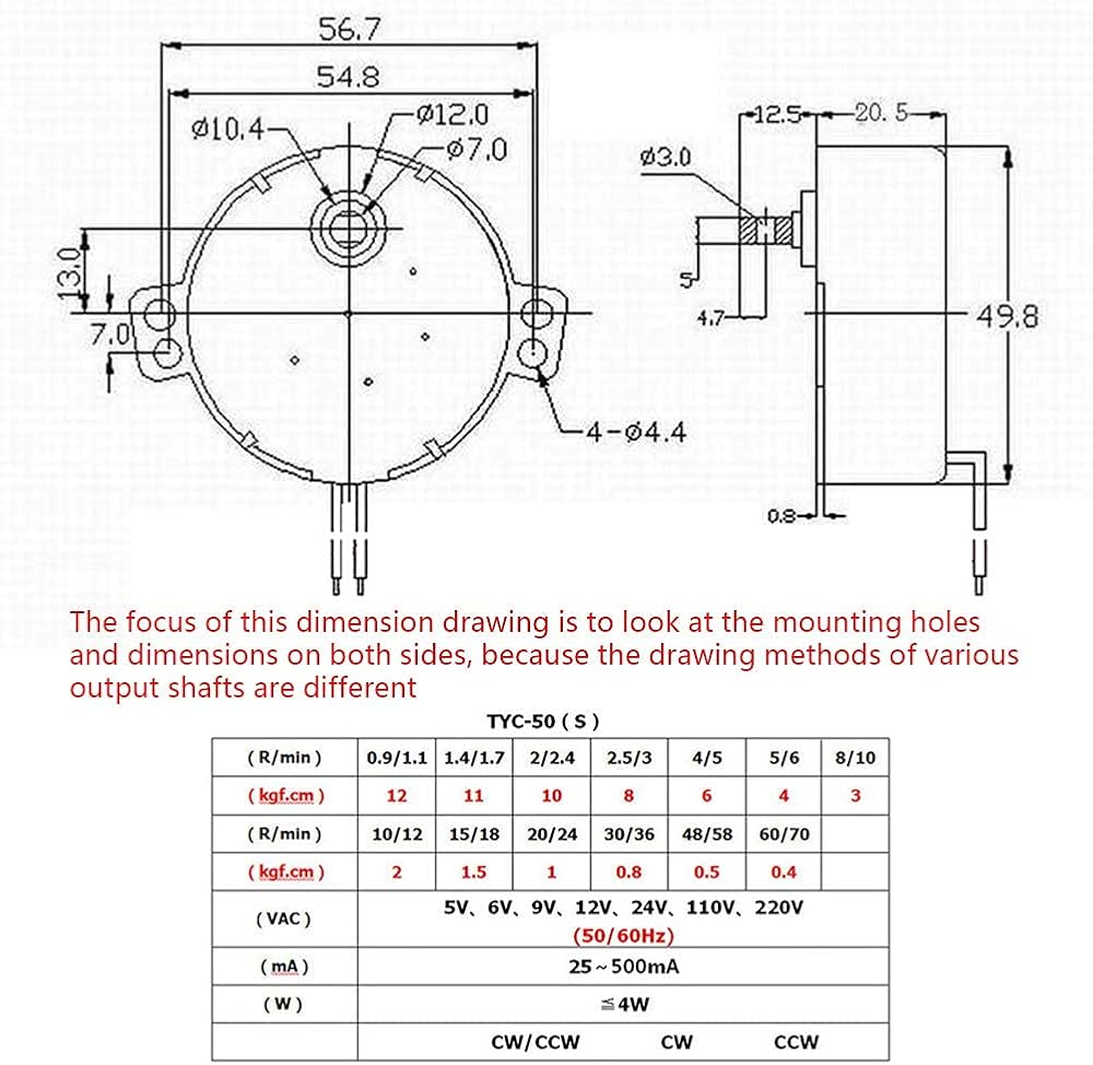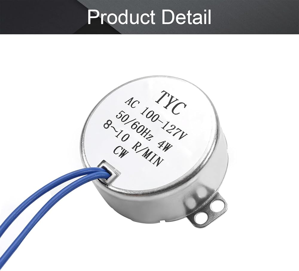 【المعلمات 】-الجهد: تيار متردد 110 فولت؛ السرعة: 8-10 دورة في الدقيقة؛ الطاقة: 4 واط؛ الاتجاه: الأسلحة الكيميائية؛ القطر: 49.8 ملم/1.96 بوصة؛ السُمك: 20.5 ملم/0.81 بوصة؛ طول السلك: 400 مم/15.75 بوصة؛ قطر العمود: 7 مم/0.28 بوصة؛ طول العمود: 15 مللي متر/0.59"