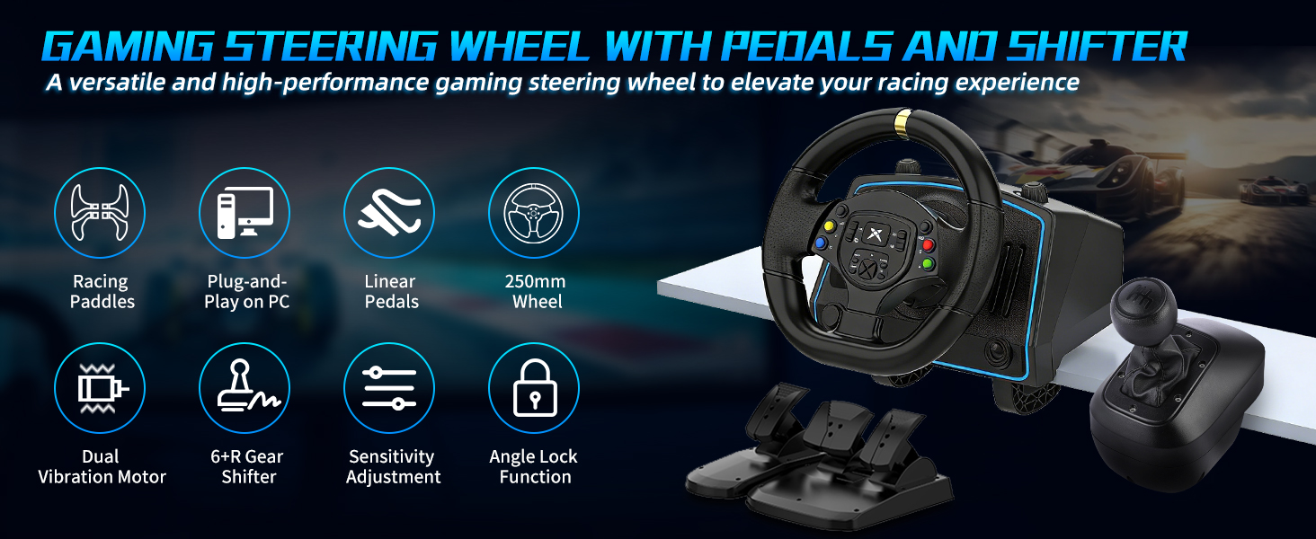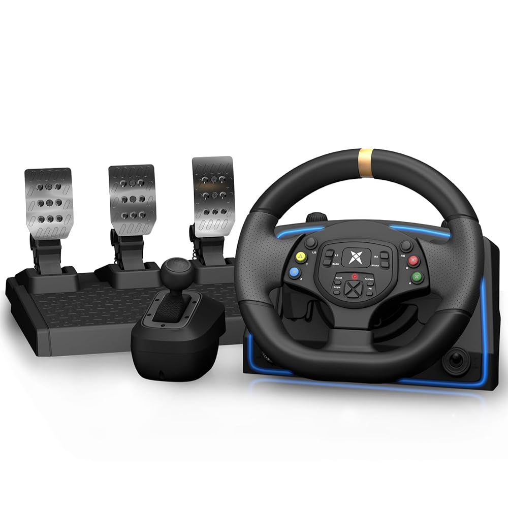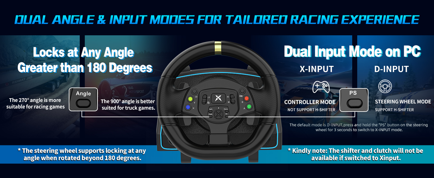 • 【التوافق العالمي 】 متوافق بسلاسة مع الكمبيوتر الشخصي (Windows 7/10/11) وPS3. التوصيل والتشغيل. يتميز بوضعين إدخال (X-INPUT: وضع وحدة التحكم وD-INPUT: وضع عجلة القيادة) للتوافق مع مجموعة واسعة من الألعاب.