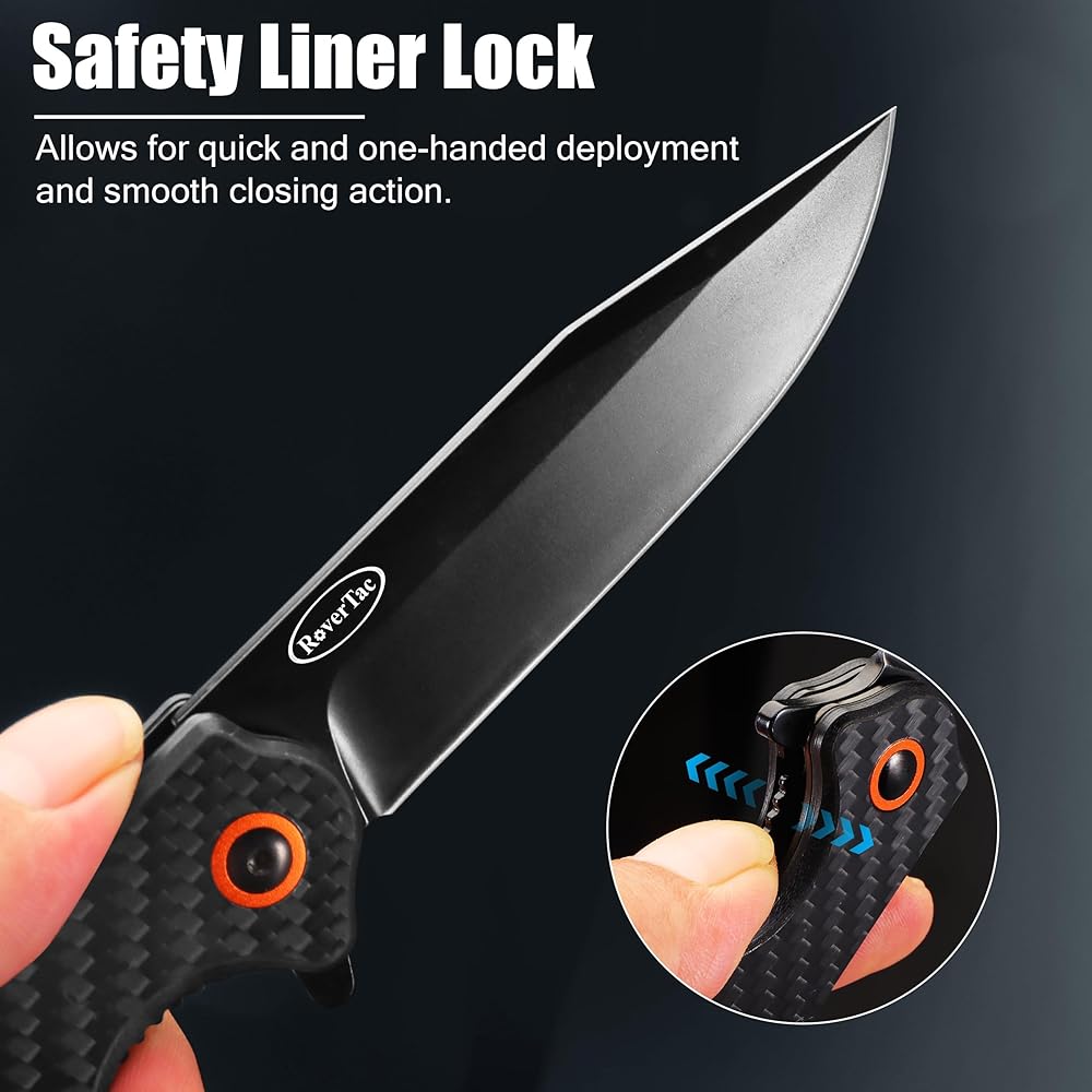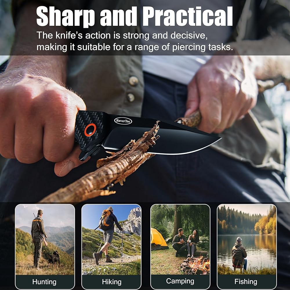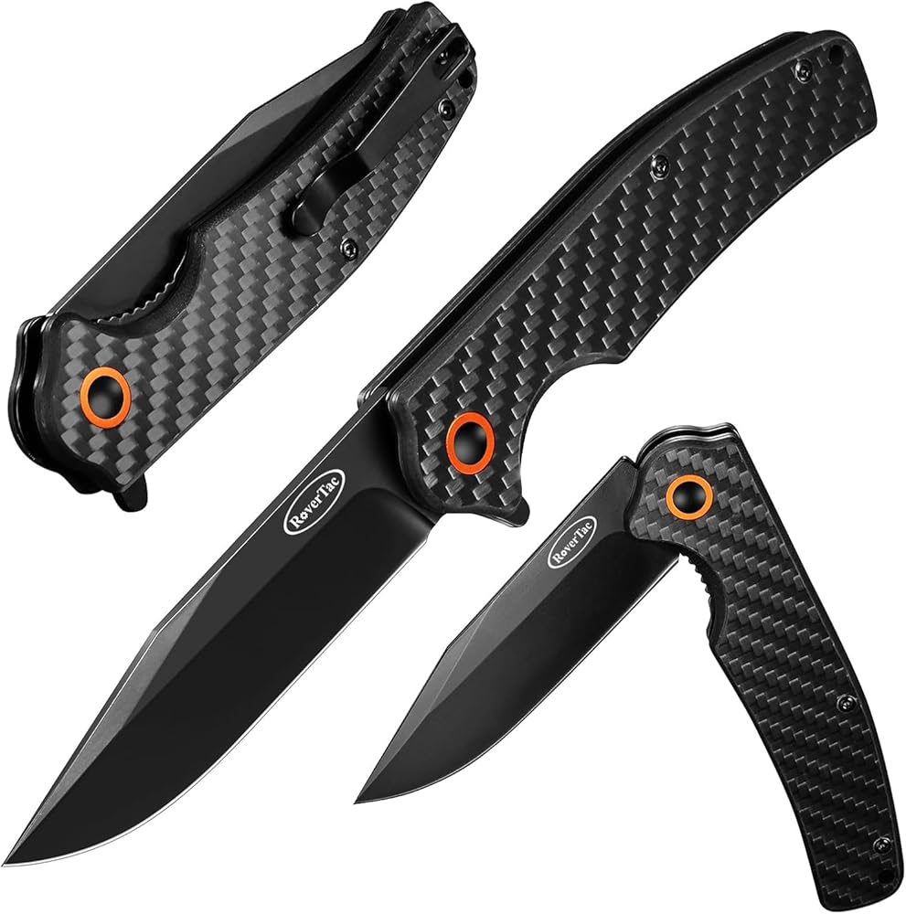 سكين جيب قابل للطي من RoverTac، شفرة D2 من الفولاذ المقاوم للصدأ مع مقبض من ألياف الكربون ومشبك قفل للجيب، مثالي للتخييم والتنزه سيرًا على الأقدام EDC، هدايا للرجال في عيد الميلاد