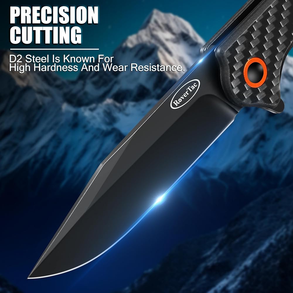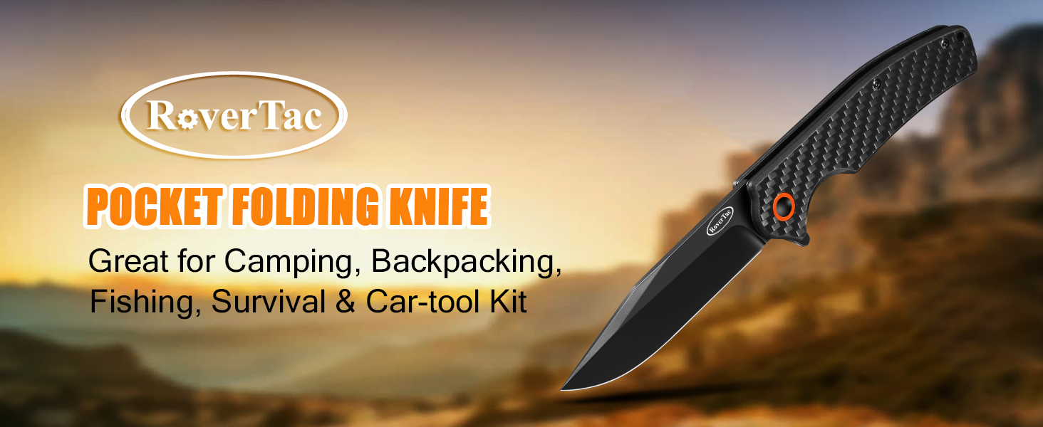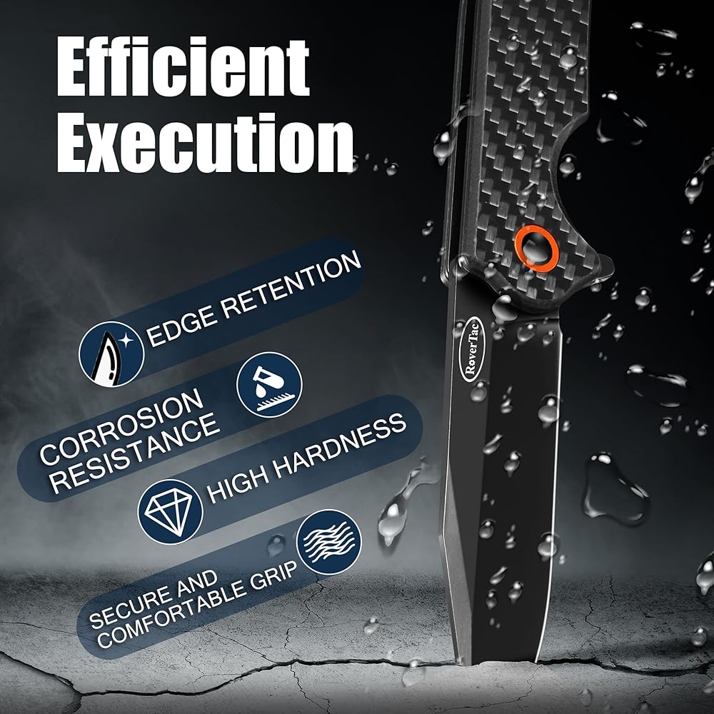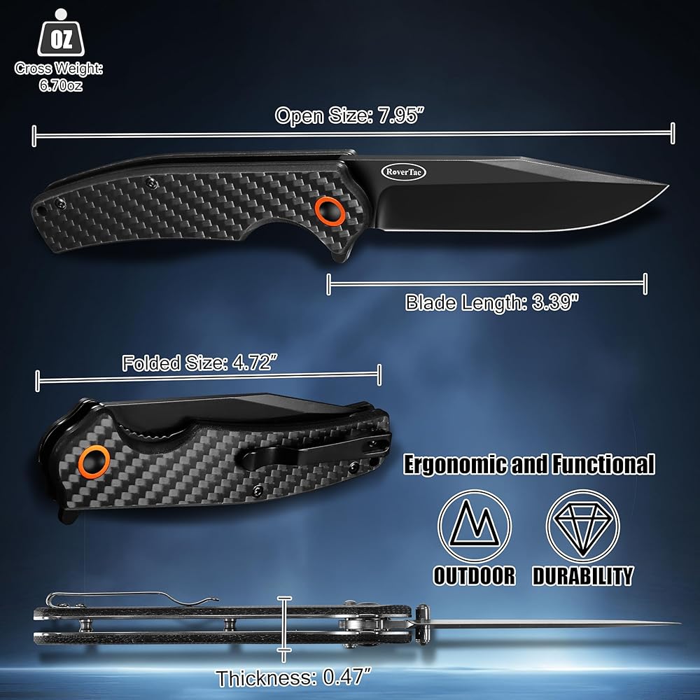 سكين جيب قابل للطي من RoverTac، شفرة D2 من الفولاذ المقاوم للصدأ مع مقبض من ألياف الكربون ومشبك قفل للجيب، مثالي للتخييم والتنزه سيرًا على الأقدام EDC، هدايا للرجال في عيد الميلاد