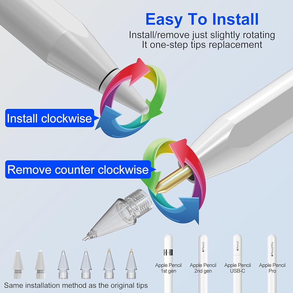 • 【سهولة التركيب والإزالة】يمكن تركيب أطراف القلم الرصاص وإزالتها بنفس طريقة استخدام أطراف قلم Apple الأصلية Pro/USB-C/ 1st / 2nd Gen. ببساطة قم بشد اتجاه عقارب الساعة للتثبيت الناجح. للإزالة، قم بإدارة عكس اتجاه عقارب الساعة. يتم تثبيتها بشكل مثالي على قلم Apple ولا تسبب ضررًا لقلم iPencil
