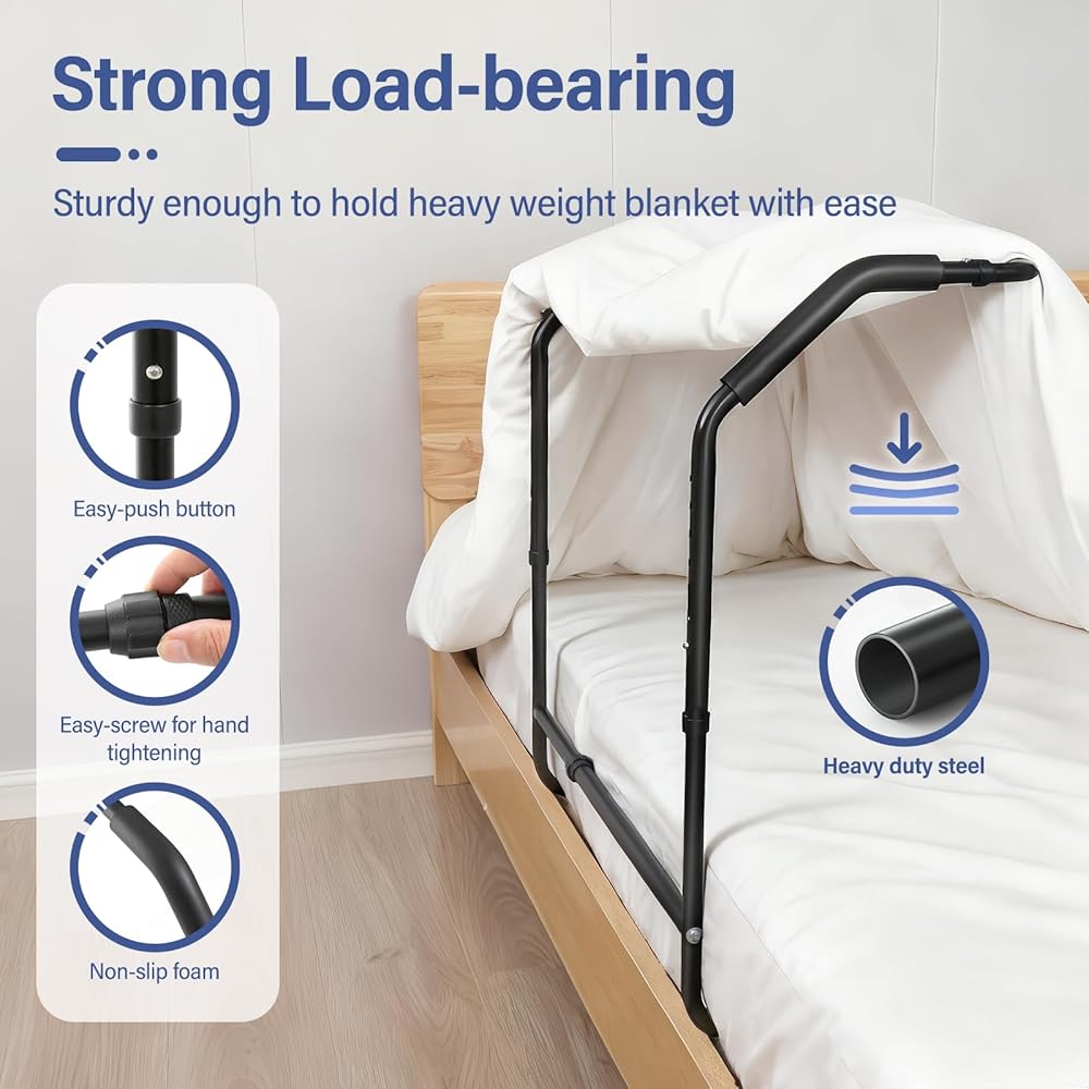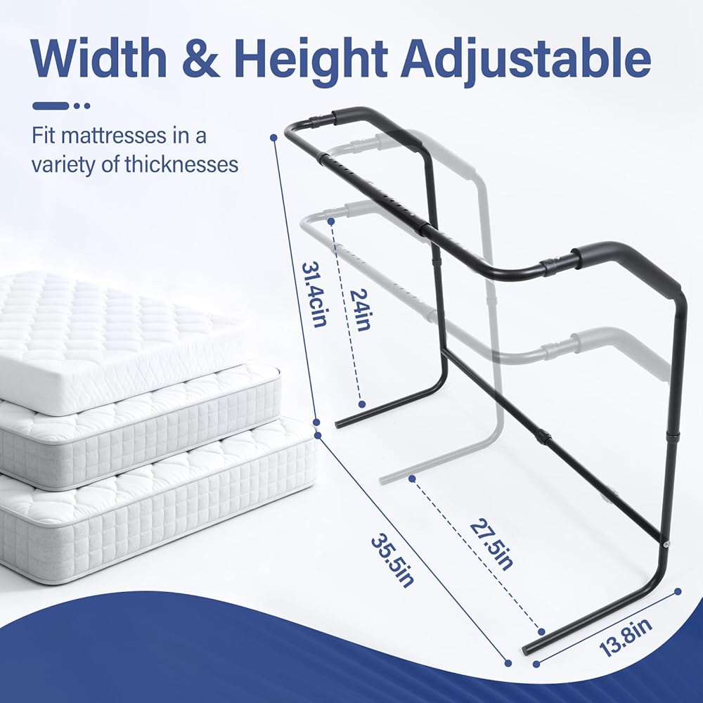 تصميم عريض للغاية وقابل للتعديل - نطاق العرض قابل للتعديل من 27.5 إلى 35.5 بوصة (70-90 سم)، يوفر مساحة أكثر اتساعًا لقدميك لتستريح بشكل مريح، ويمكن استخدامه لسرير مزدوج أو حتى بحجم كينج. يبلغ ارتفاع رافع البطانيات هذا 24-31.4 بوصة (60-80 سم) لجميع مراتب السُمك.