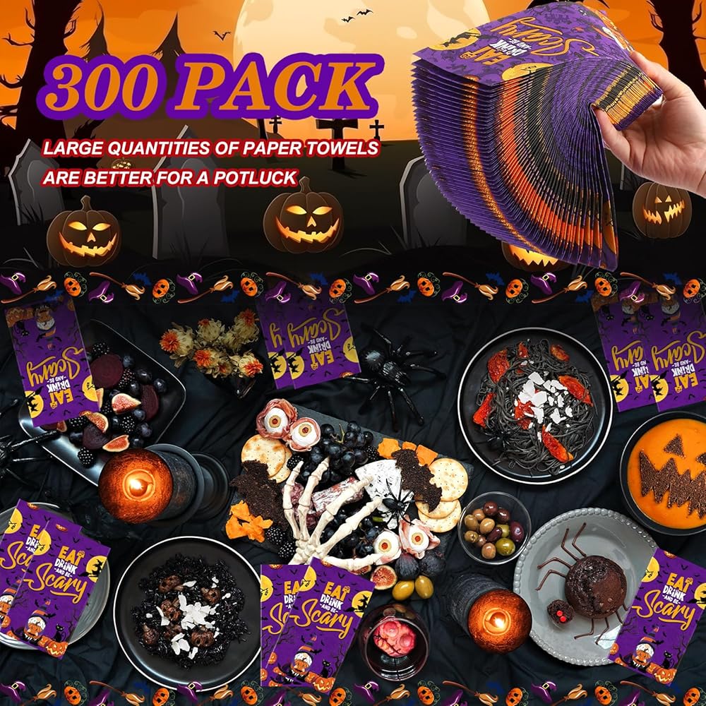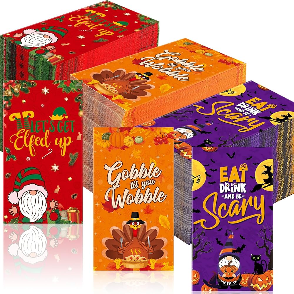 Package Includes: you will receive 300 count thanksgiving Halloween Christmas theme disposable napkins; 2 different styles can be applied to use and render the festival atmosphere, keeping your tables clean and safe from spilled food, milk, juice; The number of napkins can meet your family and party needs, adding some fun to the upcoming Thanksgiving, Halloween Christmas