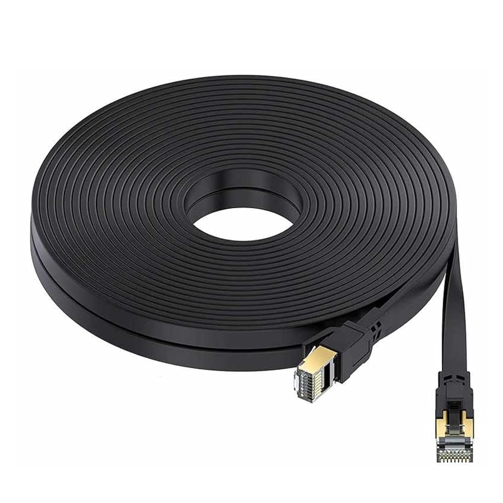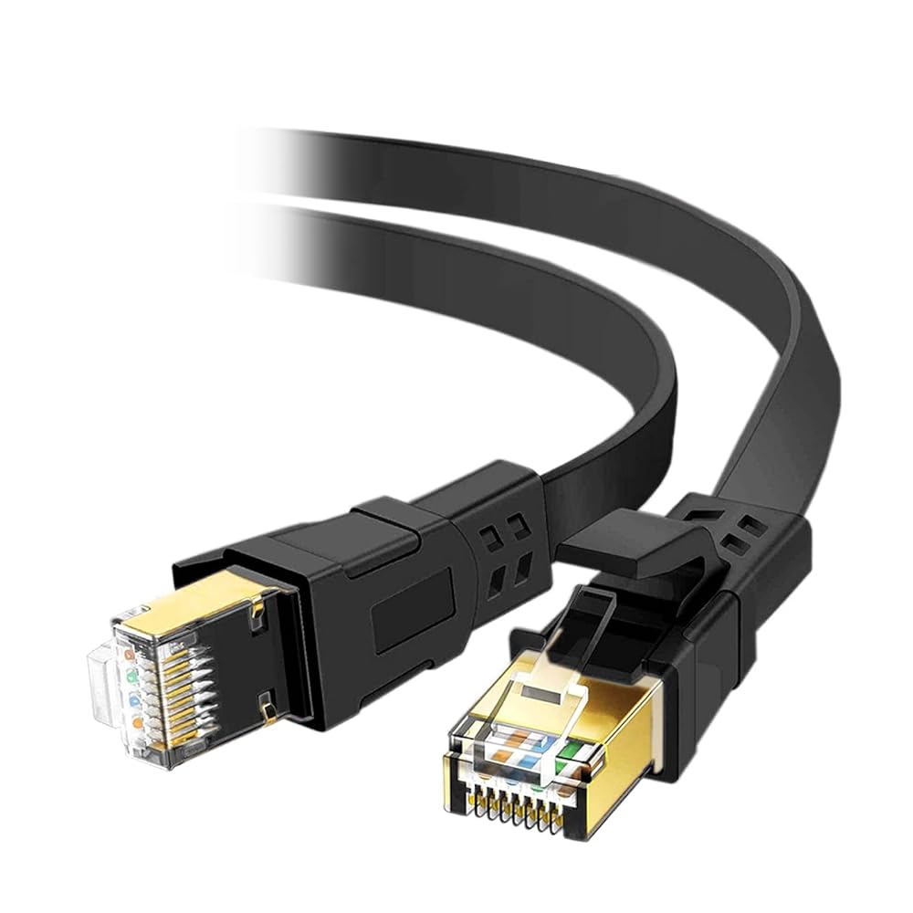 This flat Ethernet cable delivers reliable, high-speed network connectivity for your home or office setup. Featuring gold-plated connectors, this cable ensures optimal signal transfer and resistance to corrosion for long-lasting performance. The sleek black flat design makes it easy to run under carpets, along baseboards, or through tight spaces without the bulk of traditional round cables. Perfect for connecting computers, gaming consoles, smart TVs, routers, and other network devices, this cable provides a stable wired connection that's ideal for streaming, gaming, and data-intensive tasks. The flat construction prevents tangling and allows for neat cable management, keeping your workspace organized and professional-looking. Whether you're setting up a new network or replacing an old cable, this Ethernet cable offers the performance and durability you need for seamless connectivity.