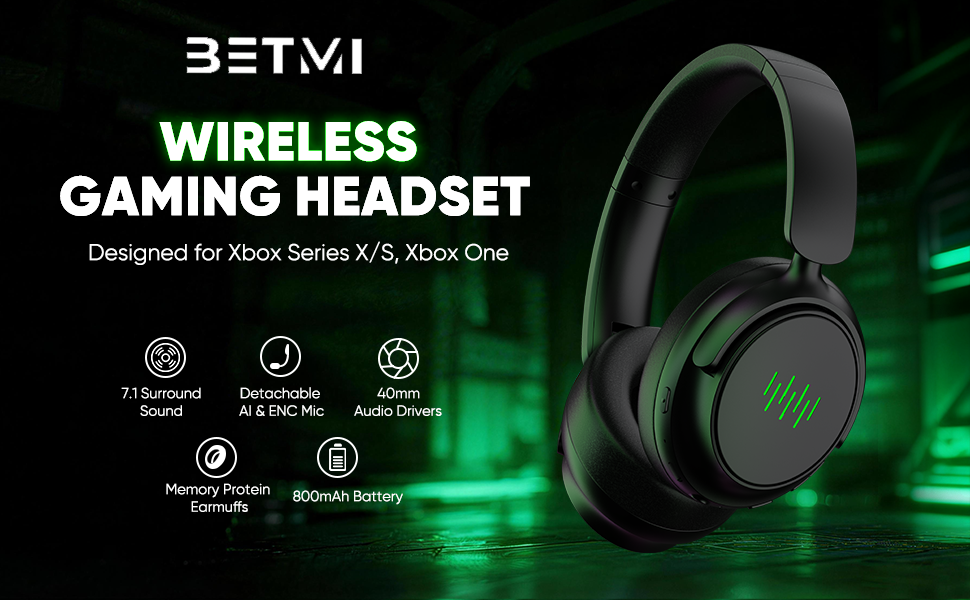 • توافق سماعة الرأس BETMI فوق الأذن: تم تصميم سماعة الألعاب اللاسلكية لوحدات تحكم Xbox الرسمية (متوافقة مع Xbox Series X/S وXbox One). وهو متوافق أيضًا مع أجهزة الكمبيوتر الشخصية وPS-5/4 وMac وAndroid وSwitch 2/Switch. استمتع باللعب بزمن وصول منخفض (≥20 مللي ثانية) وصوت فائق الوضوح مع توافق واسع للألعاب الشائعة