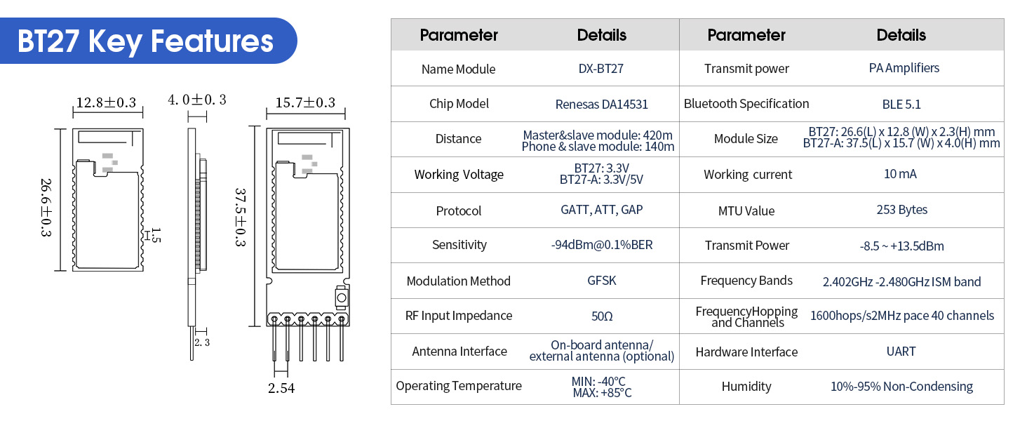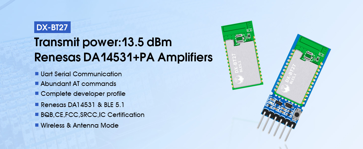 【أوامر AT】تحتوي وحدة البلوتوث DX-BT27 على مجموعة متنوعة من أوامر AT. يمكنك استخدام أوامر AT للاستعلام وتعيين معلمات الوحدة، مثل: تعيين اسم الجهاز، وتعيين معدل الباود، وتعيين UUID، وتعيين طاقة الإرسال، وتعيين وقت البث، وقطع اتصال الأمر، وإعادة التشغيل، وما إلى ذلك (يمكنك التحقق من المعلومات للحصول على المزيد من أوامر AT). لا تحتاج إلى تطوير برنامج البلوتوث مرة أخرى، فهو يساعدك على تطوير منتجاتك والتحقق منها بسرعة.