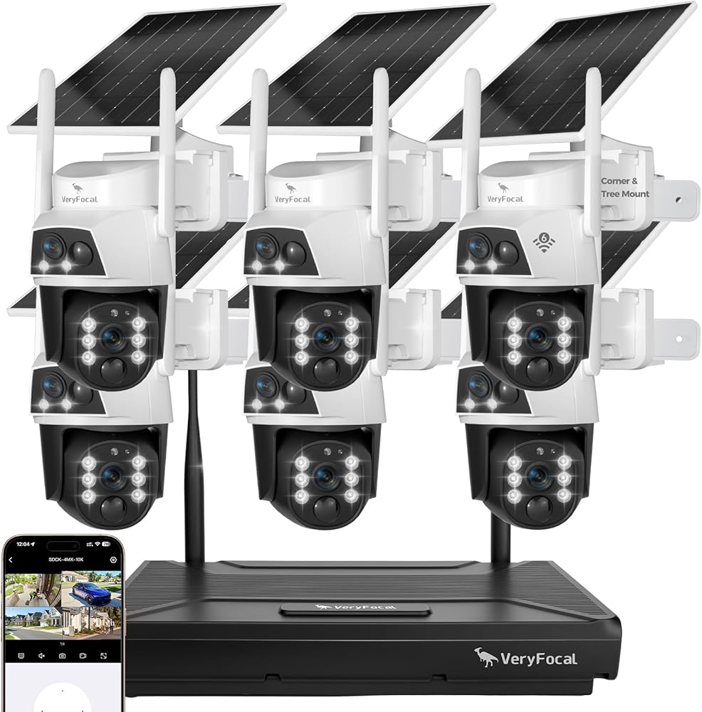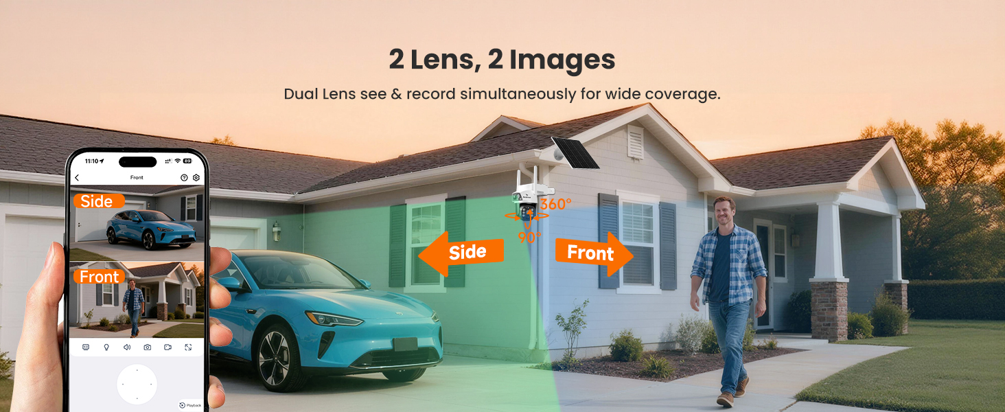 【6- 𝐂𝐚𝐦𝐞𝐫𝐚 𝐃𝐮𝐚𝐥 𝐋𝐞𝐧𝐬 + 𝟑𝟔𝟎° 𝐏𝐓𝐙 𝐍𝐨 تغطي 6 كاميرات مزدوجة العدسات (ثابتة + تتبع PTZ) 6 مناطق رئيسية - توفر كل كاميرا رؤية شاملة بزاوية 360 درجة، مما يزيل البقع العمياء للساحات والجراجات والشرفات والممرات.