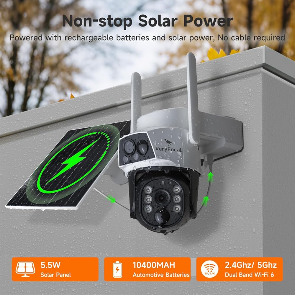 【𝐒𝐨𝐥𝐚𝐫 𝐏𝐨𝐰𝐞𝐫 + 𝟏𝟎𝟒𝟎𝟎𝐦𝐀𝐡 𝐋𝐨𝐧𝐠 𝐋𝐢𝐟𝐞】5.5W يتم شحن الألواح الشمسية عالية الكفاءة على مدار الساعة طوال أيام الأسبوع (تعمل في الأيام الغائمة/الممطرة/الثلجية) + بطاريات من فئة السيارات - تدخل تلقائيًا في وضع السكون لتوفير الطاقة عندما لا يتغير المشهد، وتطلق التسجيل فورًا بمجرد اكتشاف الحركة (لا توجد أحداث مفقودة). طاقة التوصيل اختيارية، لا حاجة للشحن المتكرر.
