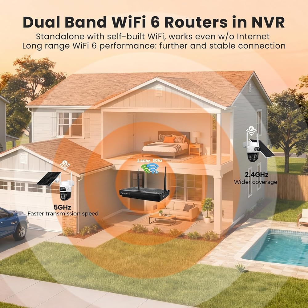 【𝐍𝐕𝐑 𝐁𝐮𝐢𝐥𝐭-𝐢𝐧 𝐖𝐢𝐅𝐢 𝟔】يحتوي NVR على جهاز توجيه WiFi 6 مستقل - تتصل الكاميرات مباشرة بـ NVR، وإشارة مستقرة تصل إلى 400 متر في المناطق المفتوحة، مثالية للساحات/المزارع الكبيرة.