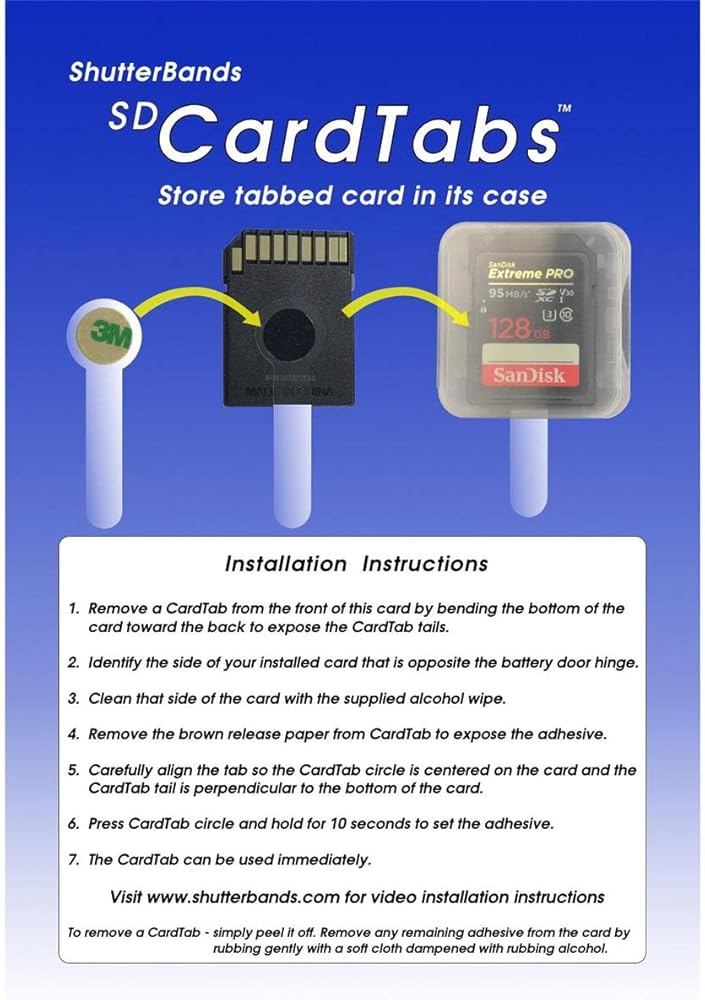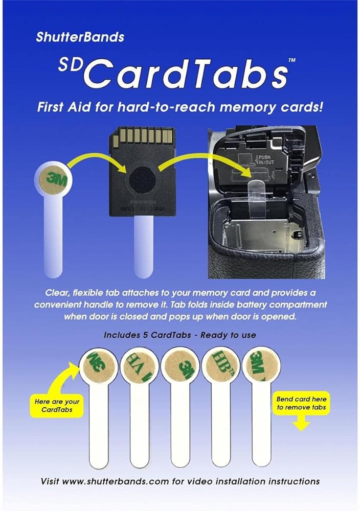 The tab provides a handle to facilitate removing the memory card without finger gymnastics. Your "tabbed" memory card will still fit nicely in its original clamshell case when it's not in use. And when it's installed in your camera and you want to remove it - you'll be able to do so quickly with total control. SD CardTabs comes ready to use in a 5-pack. Another innovative product from ShutterBands.