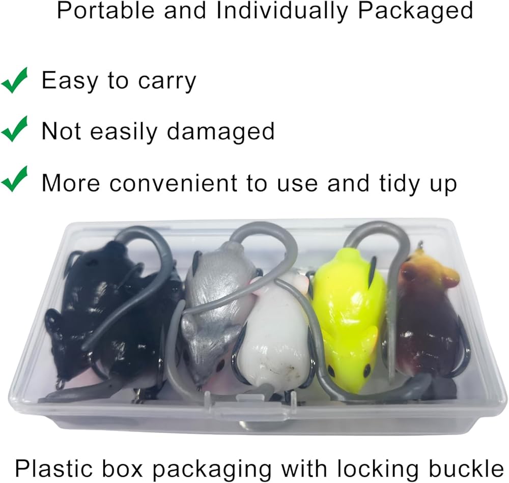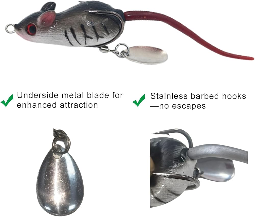 Dominate the waters with this premium rat fishing lure - the ultimate mouse lure engineered for trophy catches. Our mouse lures for fishing feature life-like 3D eyes and authentic mouse tails for trout fishing action that drives predators wild. Perfect as top water baits for bass fishing, this rat lure creates irresistible surface commotion with its 45-degree weighted design, mimicking distressed rodents to trigger explosive strikes from Bass, Trout, Pike and more. The mouse fishing lure's dual wedge hooks guarantee solid hooksets while its rugged construction withstands savage attacks in both fresh and saltwater. Whether you're targeting Redfish in marshes or Walleye in lakes, this rat fishing lure outperforms standard baits. Gift the advantage - this professional-grade mouse lure makes the perfect present for anglers who demand results.