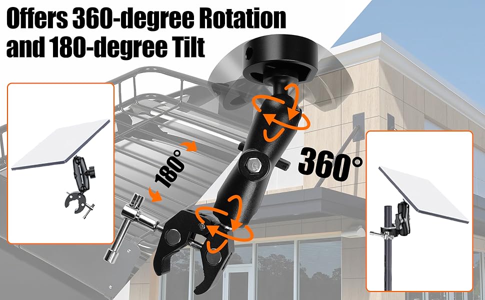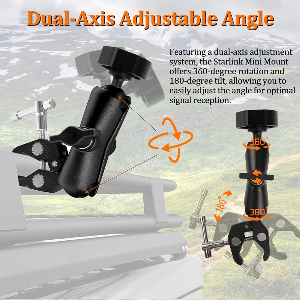 زاوية قابلة للتعديل ثنائية المحور: يتميز نظام تعديل ثنائي المحور، حيث يوفر حامل Starlink Mini Mount دورانًا 360 درجة وإمالة 180 درجة، مما يسمح لك بضبط الزاوية بسهولة للحصول على استقبال مثالي للإشارة. سواء كنت أثناء التنقل أو في المنزل، يمكنك ضمان اتصال موثوق به مع تحديد الموقع المثالي.