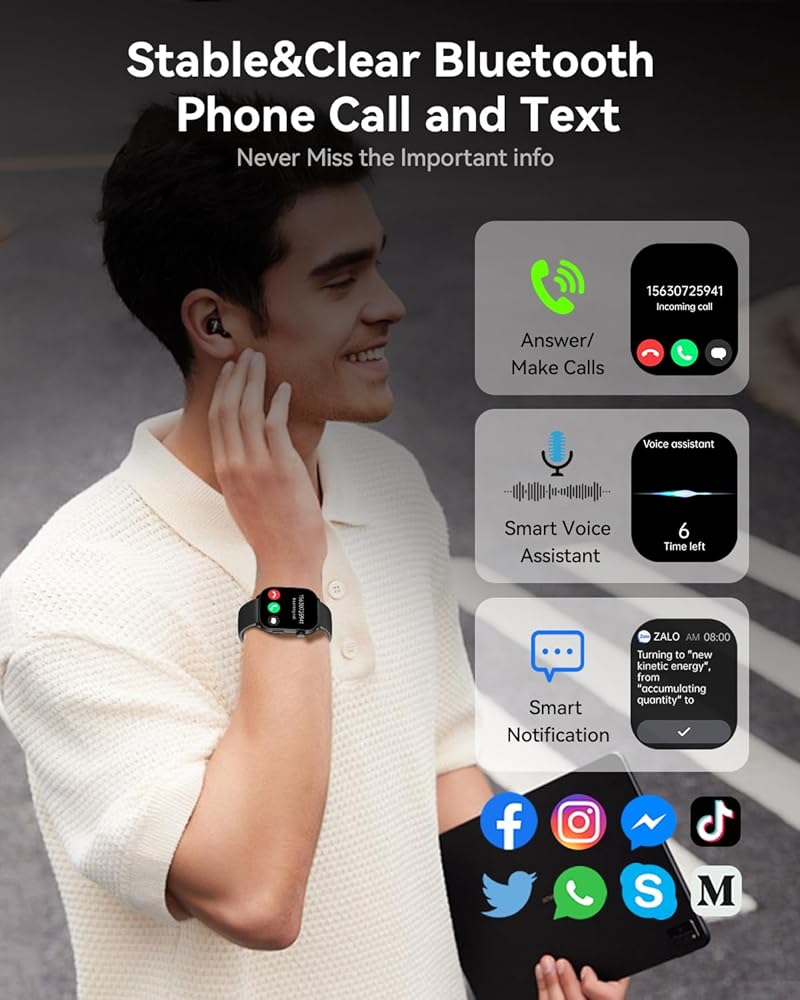 【مكالمات بلوتوث وإشعارات ذكية】قم بإجراء واستقبال المكالمات بصوت عالي الجودة باستخدام ميزة البلوتوث على ساعتك الذكية. ابق على اطلاع بالتنبيهات الواردة من Facebook وWhatsApp وInstagram وTwitter وTikTok وMessenger والمزيد. استخدم الأوامر الصوتية مع المساعد المدمج للتحكم في الموسيقى والتحقق من الطقس والإنذارات والمزيد. (ملاحظة: يجب ربط هذه الساعة الذكية بتطبيق Kstyle OS للاستخدام الأول.)