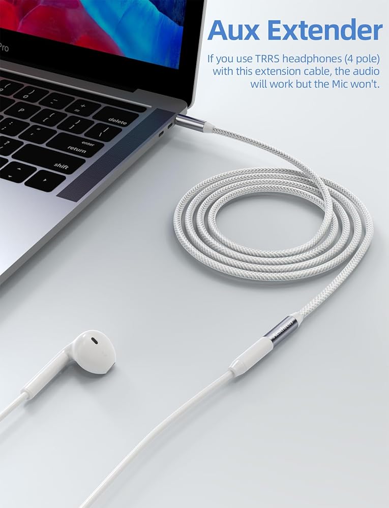 • هام: لا يمكن استخدام كبل تمديد الصوت مقاس 3.5 مم مع عناصر التحكم في مستوى الصوت المضمنة في سماعات الرأس. إذا كنت تستخدم سماعة رأس TRRS (ذات 4 أقطاب) مع سلك التمديد هذا، فسيعمل الصوت، لكن لن يعمل الميكروفون. (فقط لـ TRS)