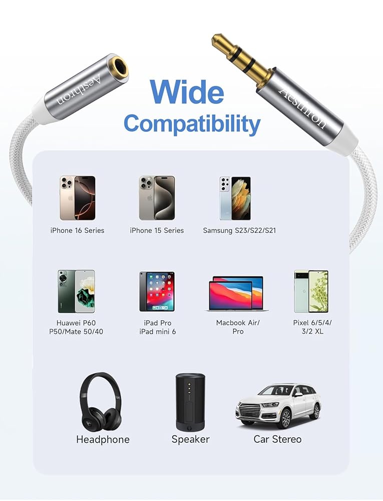 • توافق واسع: كابل تمديد سماعة الرأس من الذكور إلى الإناث يجعل من السهل توسيع منطقة الاستخدام، مما يساعدك على تمديد الاتصال بين مشغل MP3 أو الهاتف أو الجهاز اللوحي أو أي أجهزة أخرى بمنفذ aux مقاس 3.5 مم إلى سماعات الرأس أو سماعات الأذن أو مكبرات الصوت أو استريو السيارة أو نظام المسرح المنزلي