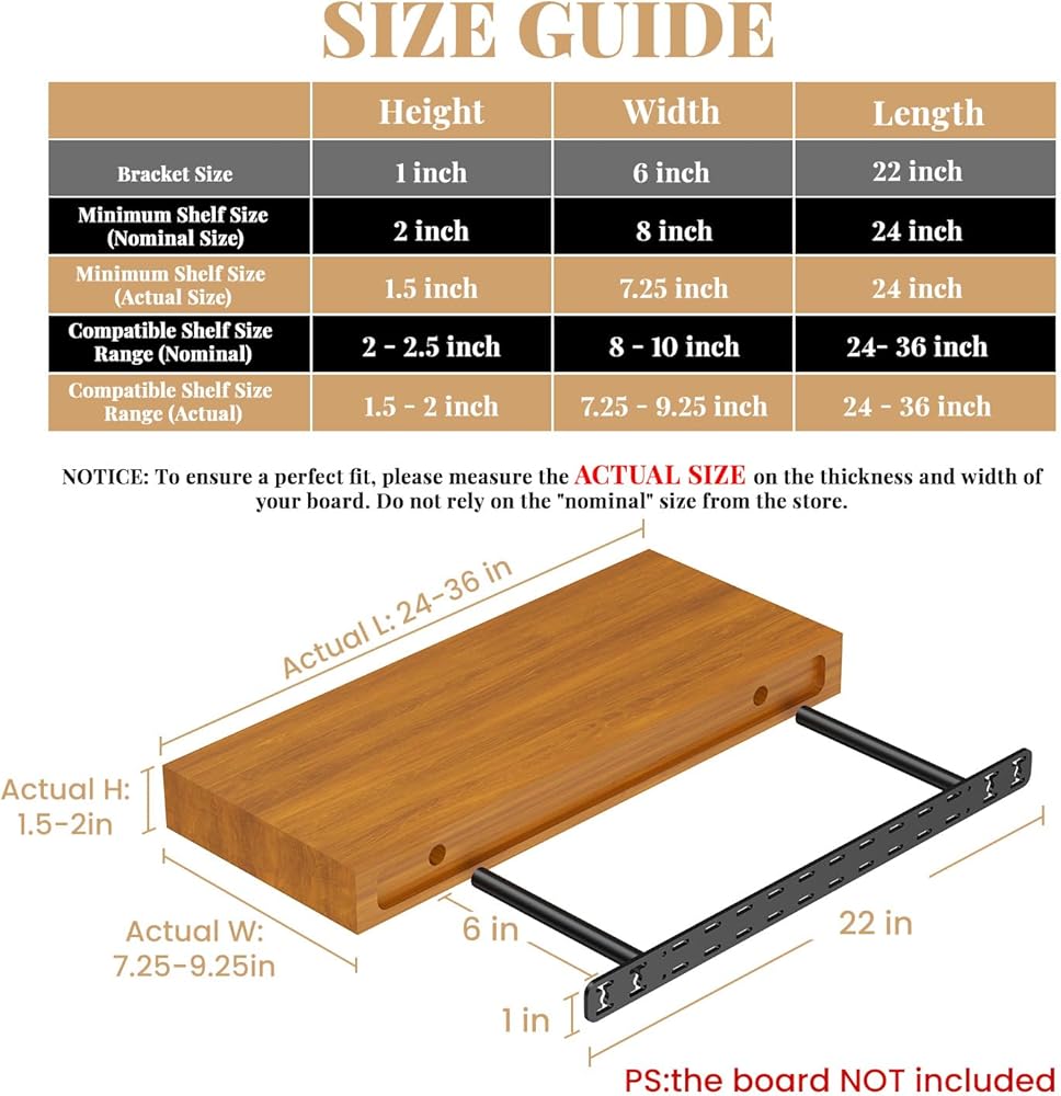 ملاحظة: يبلغ حجم اللوحة الخلفية لدعامة الرف العائمة هذه 1 بوصة، وهي مناسبة للألواح الخشبية بسمك 1.5 إلى 2 بوصة. يرجى التأكد من المقاس قبل الشراء (ملاحظة: الرف غير متضمن).