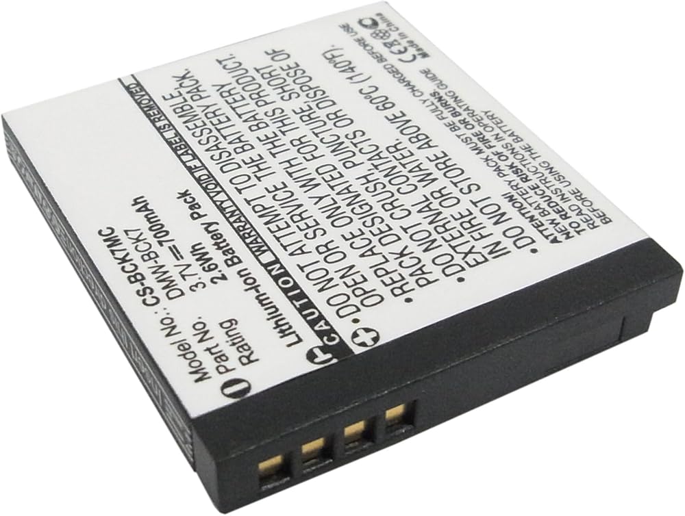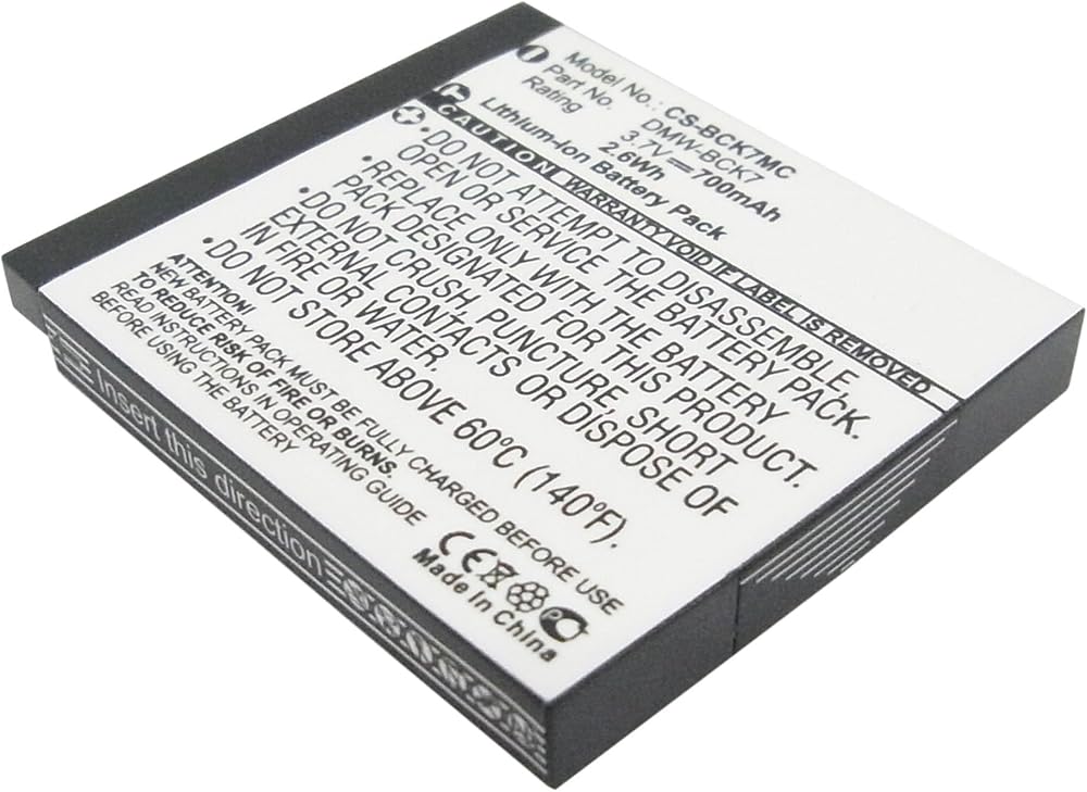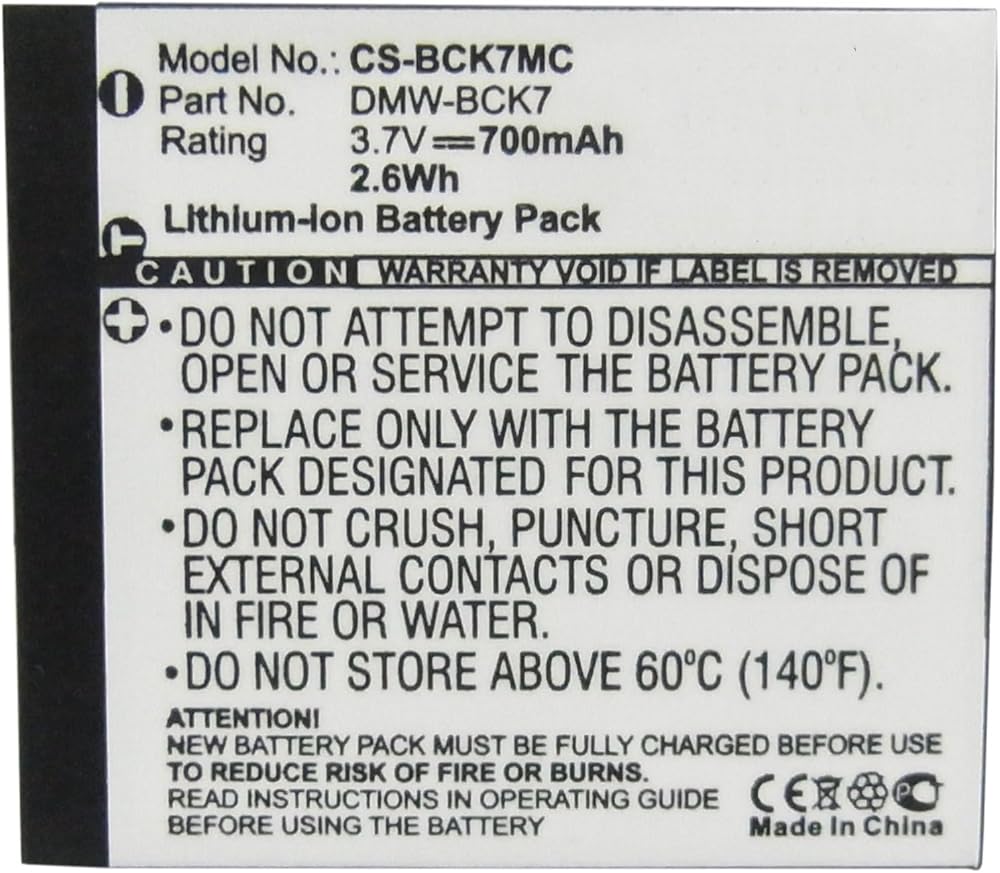 Fit Model for Panasonic Lumix DMC-S3 DMC-FH2, DMC-FH25, DMC-FH27, DMC-FH27K, DMC-FH27S, DMC-FH5, DMC-FP5, DMC-FP7, DMC-FS16, DMC-FS18, DMC-FS35, DMC-FS37, DMC-FX77, DMC-FX78, DMC-FX78A, DMC-FX78K, DMC-FX78N, DMC-FX78P, DMC-FX78S, DMC-FX78W, DMC-FH27R, DMC-FS37K, DMC-FS37R, DMC-FS37S, DMC-FH25A, DMC-FH25K, DMC-FH25R, DMC-FH25S, DMC-FH25V, DMC-FS35A, DMC-FS35K, DMC-FS35R, DMC-FS35S, DMC-FS35V, DMC-FH24, battery Part Number VW-BCK7, DMW-BCK7, NCA-YN101F, DMW-BCK7E, DMW-BCK7PP, ACD-341, NCA-YN101H, NCA-YN101J, SDBCK7; Camera battery Capacity: 700mAh Net Weig;ht: 16.8g /0.59 oz Gross Weight: 41.8g /1.47 oz Color: Black; Dimension: 41.05 x 36.25 x 5.50mm Type: Li-ion Voltage: 3.7V Rate: 2.59Wh;