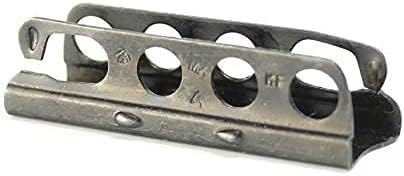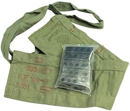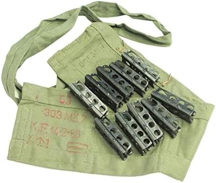 Original Australian Army issue 303 stripper charger clips x 10 with one original cotton bandolier with wire hook closures and which holds the ten clips when loaded. For use with British pattern .303's including No.1 Mk3; No4; No5 etc. New Old Stock condition. Ex-army surplus. Marked KF Mk 4 /|. Enfield .303 charger clips, essential accessories for British Lee-Enfield rifles during the 20th century, facilitated rapid reloading in combat scenarios. Crafted from durable metal, these clips securely held five rounds of .303 ammunition, ensuring swift replenishment during intense firefights. Soldiers often carried these clips in cotton bandoliers, woven for durability and comfort. The bandolier featured multiple compartments, each accommodating several clips, allowing soldiers to conveniently carry ample ammunition into battle. Compact and lightweight, these bandoliers were crucial for infantrymen, providing quick access to ammunition while maintaining mobility on the battlefield, embodying efficiency and readiness in combat situations.