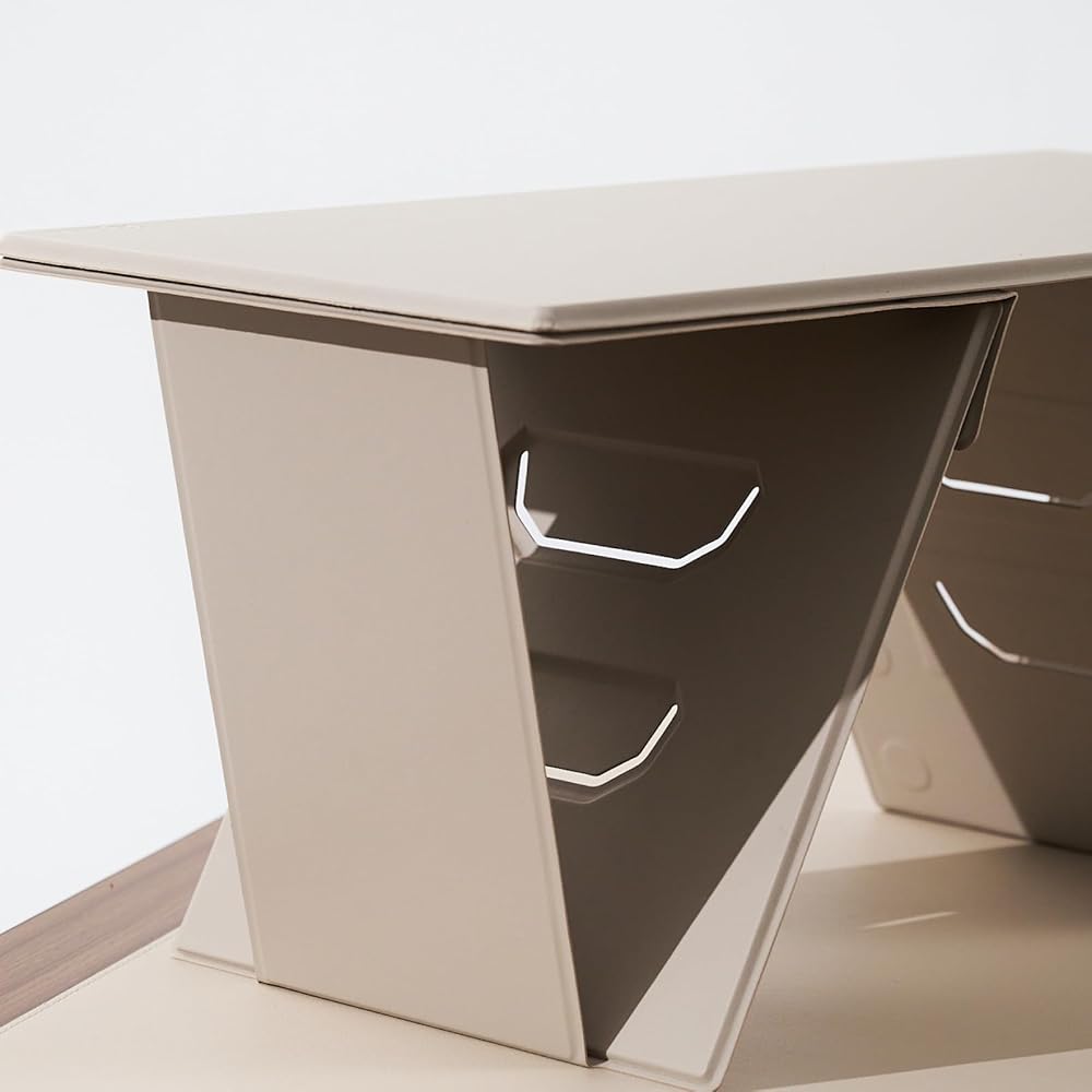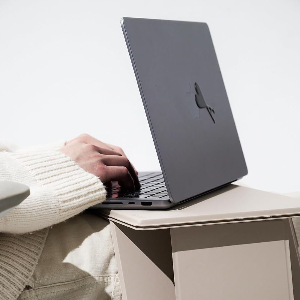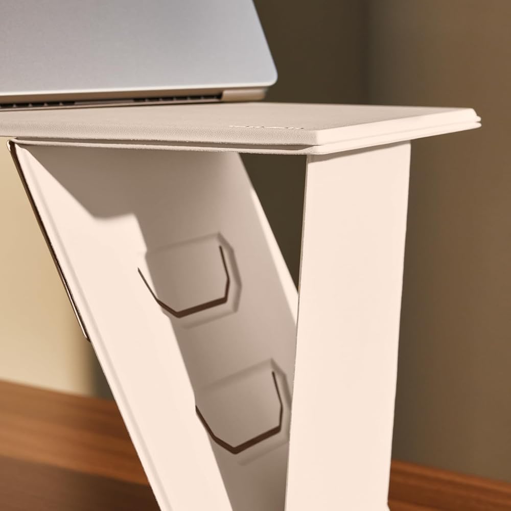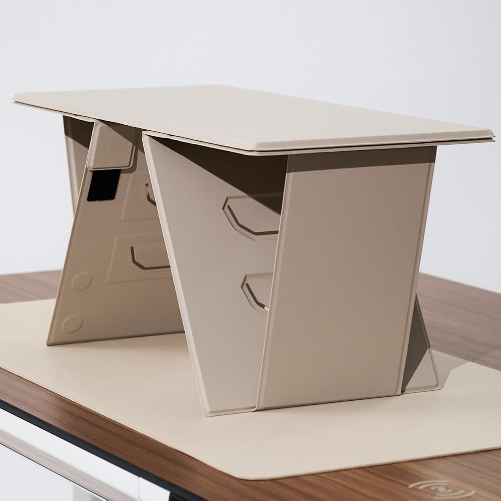 يمكن طيه بشكل مسطح للاستخدام أثناء التنقل، ولكنه يظل قويًا للغاية لدعم يديك أثناء الكتابة، بالإضافة إلى العناصر الأثقل مثل الشاشات والطابعات